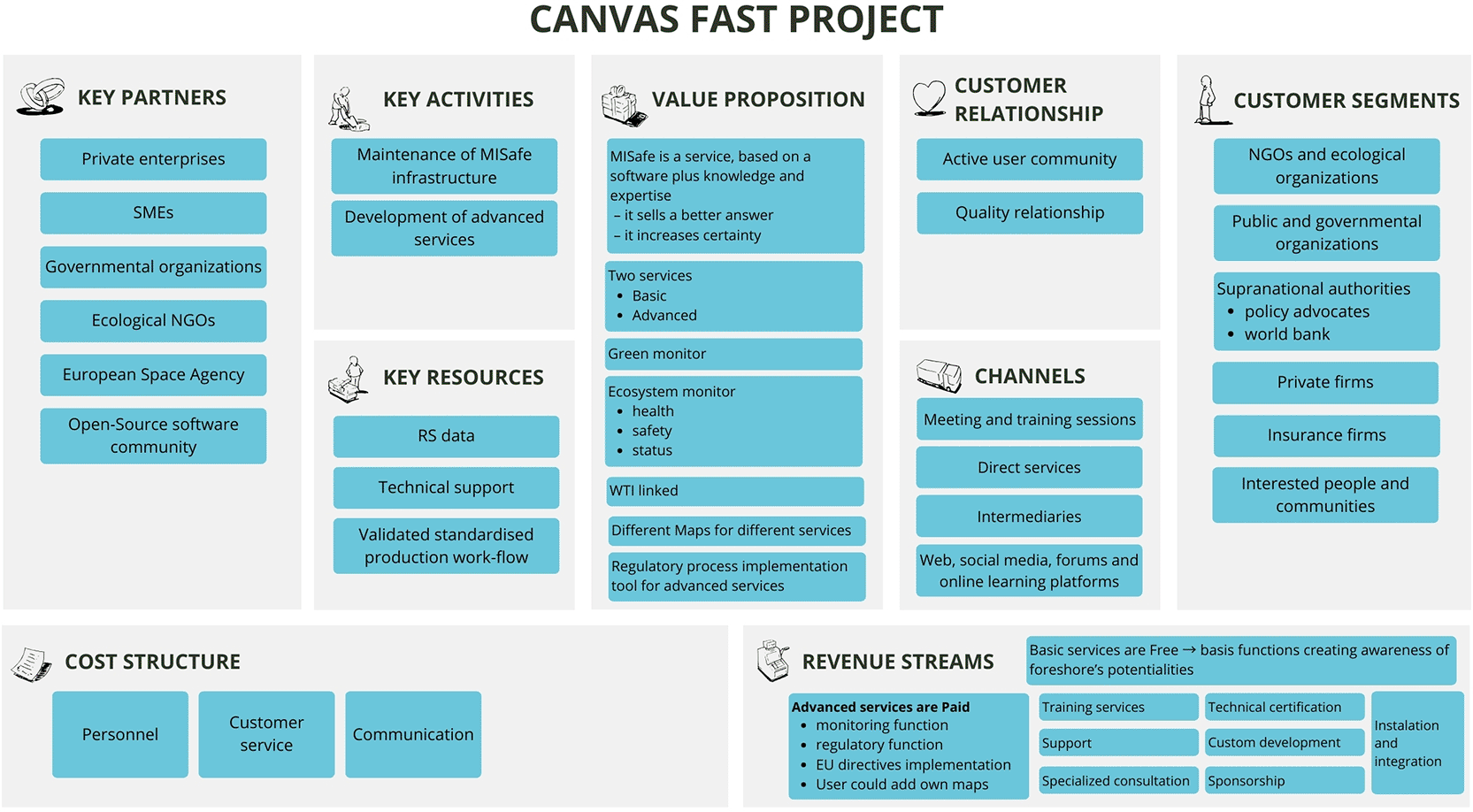 In the operational blocks of the Business Model Canvas, key activities comprise scientific development, the development of the MI-SAFE tool, interaction with users, data collection and processing, model calibration, the provision of services (educational, expert, advanced and additional), the building of a community of practice and the maintenance and development of the software. Key project resources include OT data (Sentinel), field data, algorithms developed for RS data analysis, models for predicting flood protection (such as XBeach), the OpenEarth platform, Deltares infrastructure and expertise, and the combined expertise of the FAST consortium. Key allies in developing the whole model include NGOs, public administrations, private companies, the European Space Agency, and the open-source software community. Ultimately, the long-term cost structure encompasses the maintenance of the IT infrastructure, personnel, customer service and marketing/promotion, among other elements.