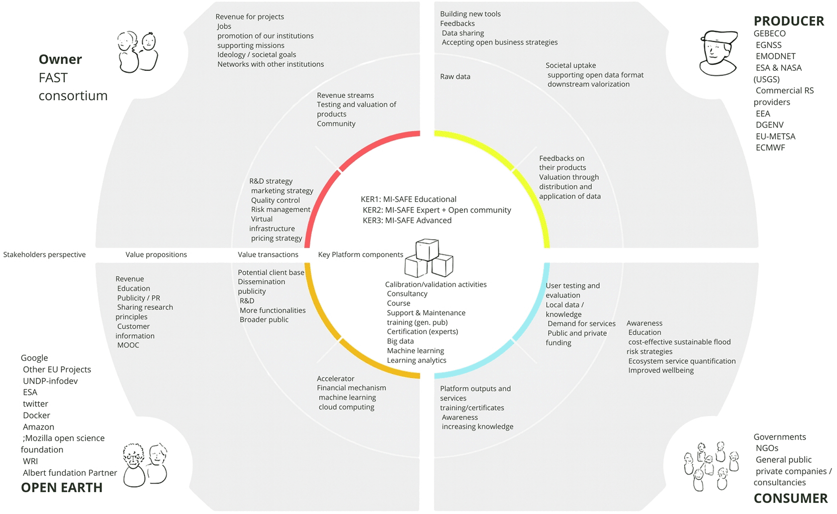This evolution of the FAST business model towards a Platform as a Service is a strategic decision that enables and facilitates the integration of the various roles of the FAST consortium partners and the involvement of the open-source community. The platform model is generally well-suited for initiatives based on open-source and public data, as it leverages the diffusion and collaboration that are intrinsic to these communities. The rationale underpinning this evolution can be articulated as follows: The FAST project was initiated to facilitate the incorporation of nature-based solutions into flood risk management, to address the questions that had emerged from these innovative techniques. For instance, it is necessary to ascertain the mechanisms by which vegetation reduces wave energy, as well as how these processes are transferred from individual plants to large foreshores. However, the development of the business strategy has demonstrated that FAST offers a wide variety of value-added services, of which software is but a small part. This point suggests that the conventional linear value transmission model from the consortia to the customers may not be adequate for effective FAST business strategy modelling. In the course of developing its former business model, FAST has transitioned from providing value-added information to private and public organisations with an interest in coastal management to a platform that enables end-users not only to consume but also to create value, thereby multiplying it. For instance, the combination of global coastal vegetation and geographical data, previously unattainable, provided by FAST, could be helpful for several purposes. These include the original purpose of applying nature-based solutions to the development of new flood risk management strategies, as well as assisting and facilitating site selections for film producers. It is important to note that platforms do not merely create content and disseminate it. These systems empower users to generate and utilise value. From a technological standpoint, external developers can expand a platform’s functionality by leveraging application programming interfaces (APIs). From a business perspective, the platform enables a select group of users — producers — to create value for another group — consumers — who then have the opportunity to consume it.