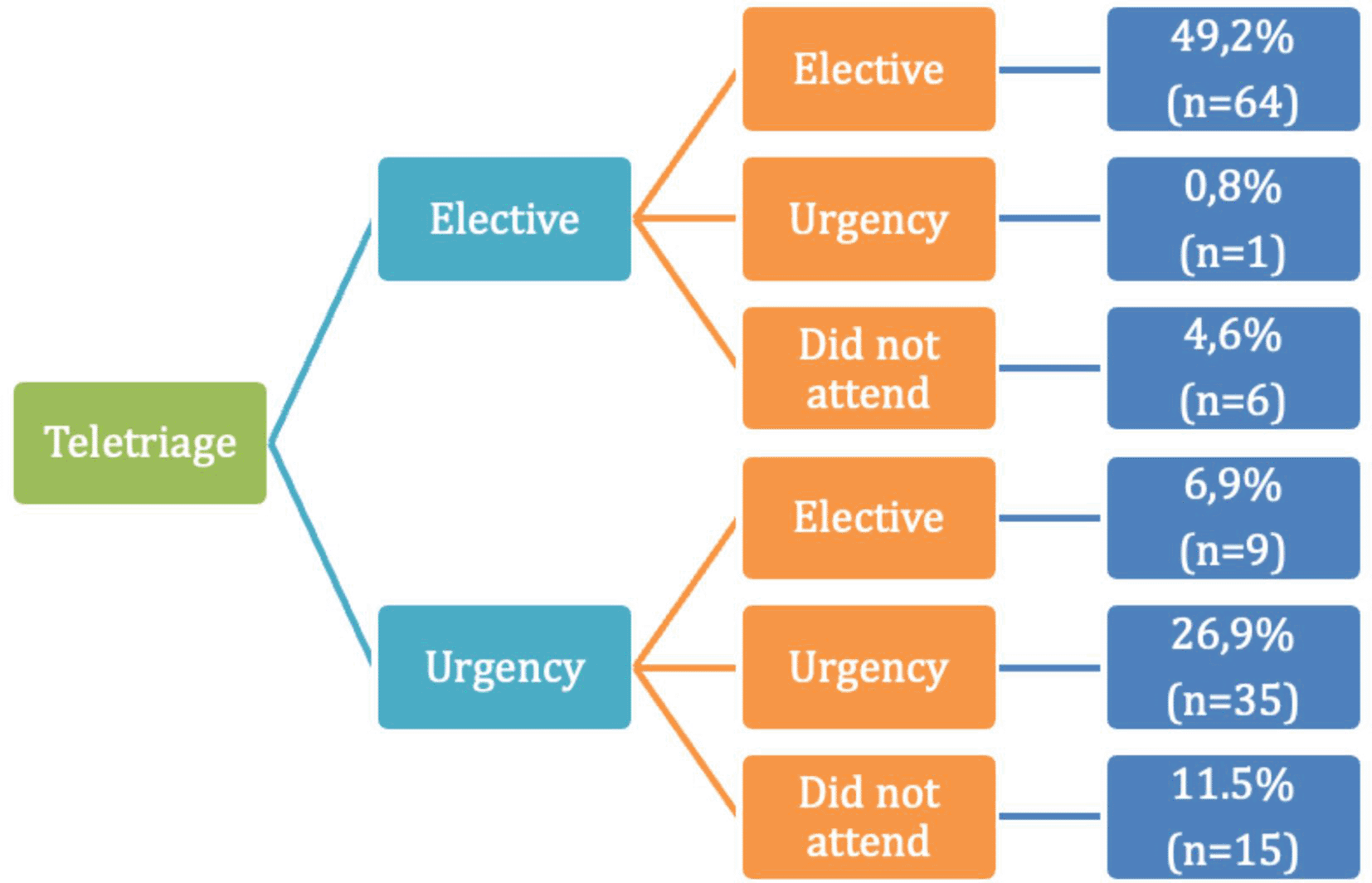 When comparing possible treatment decisions, the frequency of agreement between evaluations as elective treatment was 49.2% (n = 64), while the change from elective to urgent treatment was 0.8% (n = 1). Similarly, a frequency of 26.9% (n = 35) with agreement on the need for urgent treatment was identified, while the change from urgent to elective treatment occurred in 6.9% (n = 9) of cases. Regarding those patients who did not attend the in-person evaluation, 11.5% (n = 15) were classified as urgent in the teletriage, and 4.6% (n = 6) as elective treatment.