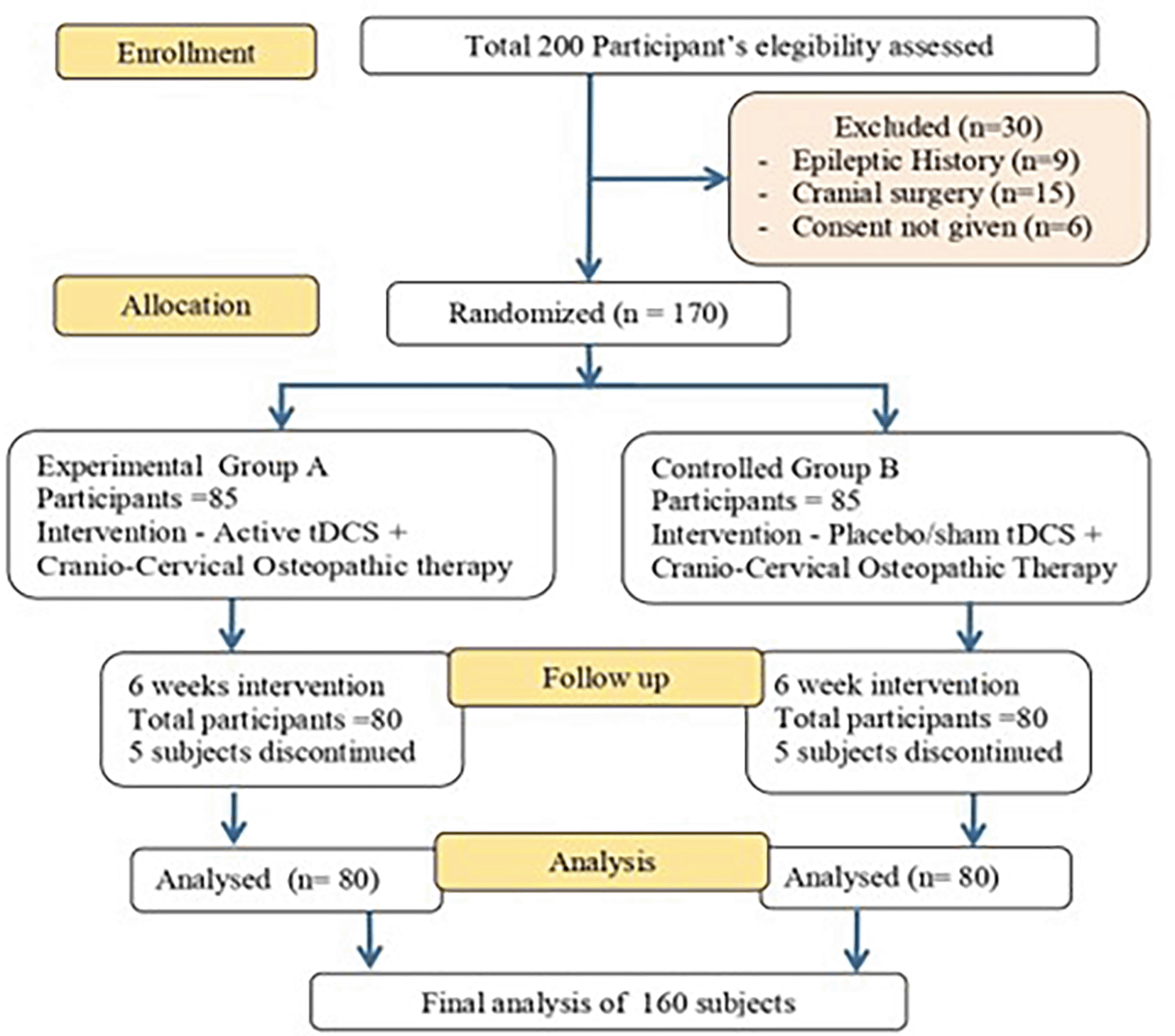 160 participants were divided into two groups at random in a 1:1 ratio. Participants were assigned to: Experimental Group A (n = 80) received active transcranial direct current stimulation (tDCS) Control Group B (n = 80) received sham tDCS in addition to traditional physiotherapy.