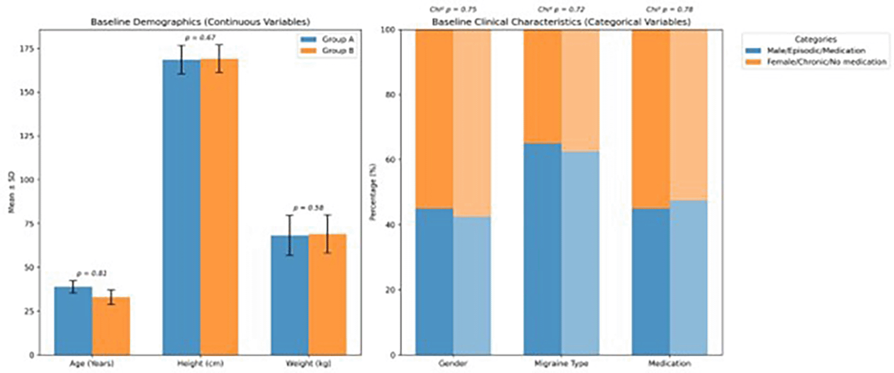 170 participants in total were randomized 1:1 (85 in Group A received active tDCS + Cranio-cervical osteopathic therapy), and 85 in Group B received sham tDCS + Cranio-cervical osteopathic therapy). there were 10 participant’s withdrawal, finally 80 participants from each group, were analysed. There was no differential loss to at the end of intervention in this reporting; all randomized participants were included in the intention-to-treat analysis (CONSORT flow provided as Figure 1). The groups’ baseline clinical and demographic traits were equal ( Table 1). The Shapiro-Wilk test was used to verify that continuous variables were normal, and parametric analyses were compatible with the majority of result distributions. The study participants’ baseline clinical and demographic traits, along with pertinent clinical metrics, are displayed in Figure 2. The information is displayed as counts and percentages for categorical variables (gender, type of migraine, and medication) and as mean ± standard deviation for continuous variables (age, height, and weight).
