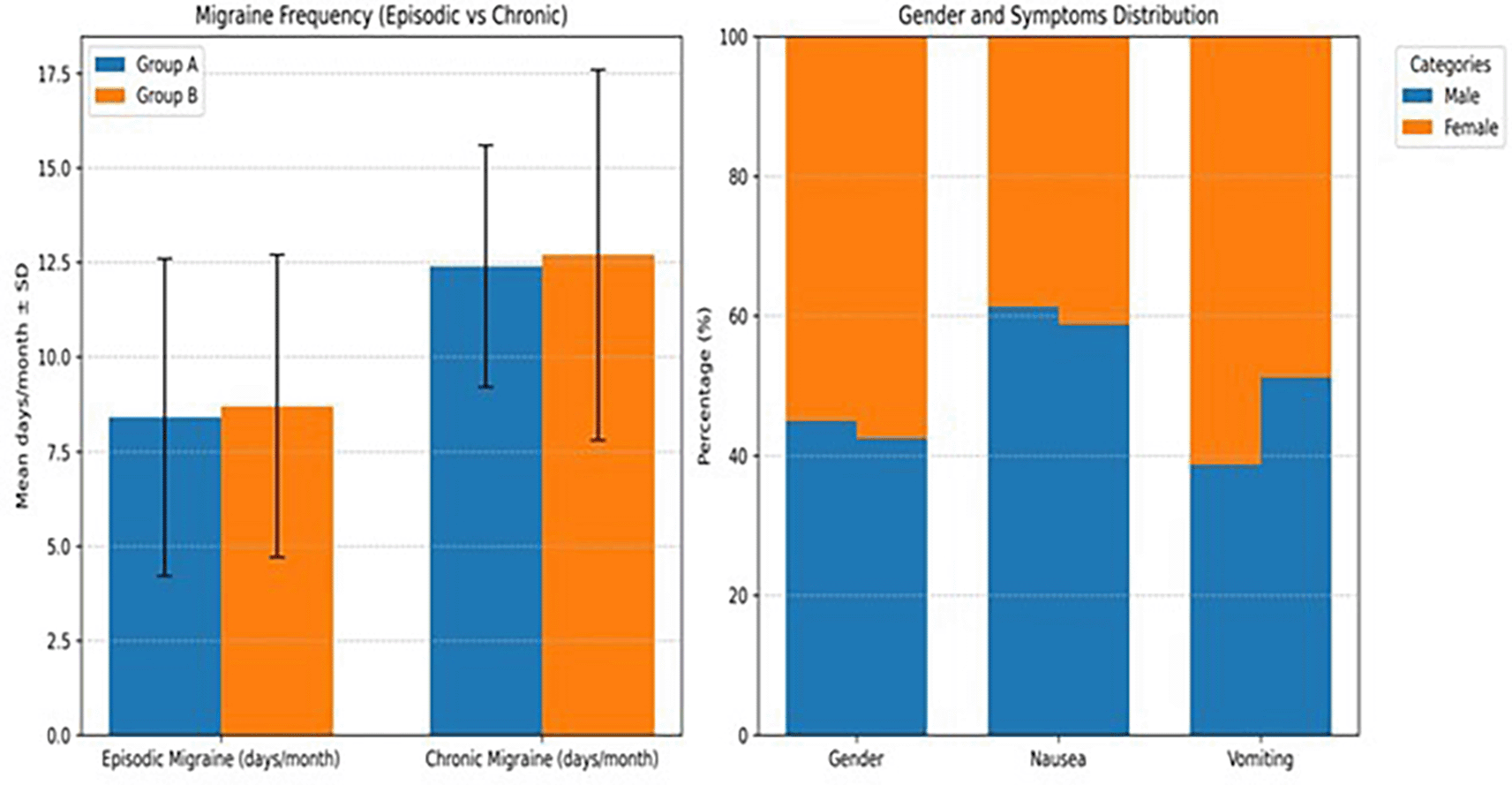Both groups had comparable migraine type, nausea and vomiting symptoms and gender distribution at baseline as given in Table 2. No statistically significant differences were observed in headache frequency or severity prior to intervention. Figure 3 shows the comparison of migraine type, nausea and vomiting symptoms and gender distribution.