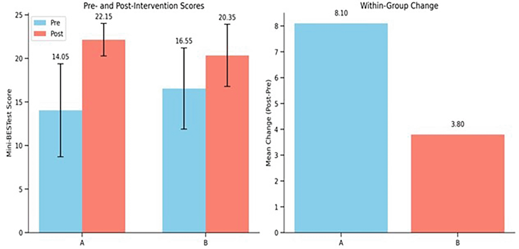 Balance scores improved in both groups, with a larger improvement in Group A in Table 5, The change was +4.30 points (95% CI 2.92 to 5.68, p < 0.001; Cohen’s d = 0.96) between groups. Each group’s paired t-tests were significant as given in Table 5. Mini-BESTest showed a significant group×time interaction (p < 0.001) according to the mixed-effects model. Figure 6 displays the balance scores for Groups A and B before and after the intervention as determined by Mini-BESTest. Bars reflect mean ± SD, and both groups improved, although Group A’s improvement in balancing performance was greater.