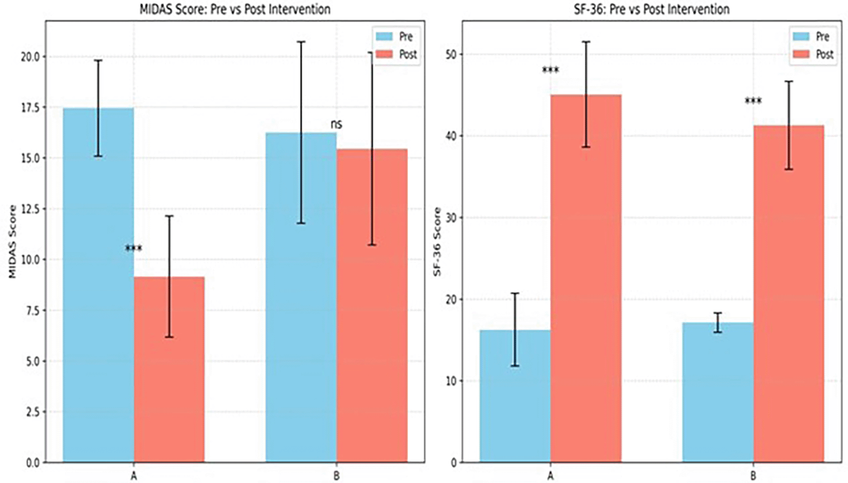 In Table 6, Group A (within-group) experienced a significant decrease in migraine disability (MIDAS), with an adjusted between-group difference of ∆ = 7.50 (95% CI 8.67 to 6.33, p < 0.001; d = 1.98). Group A experienced a greater improvement in health-related quality of life (SF-36 total): adjusted ∆ = +4.64 (95% CI 2.95 to 6.33, p < 0.001; d = 0.85). Results from mixed-effects and ANCOVA analyses were consistent. Groups A and B’s quality of life (SF-36, 0–100) and migraine-related disability (MIDAS) ratings before and after the intervention are displayed in Figure 7. The mean ± SD is shown by bars. Both groups experienced improvements in quality of life and disability, however Group A experienced slightly larger improvements in quality of life and larger decreases in migraine disability than Group B.