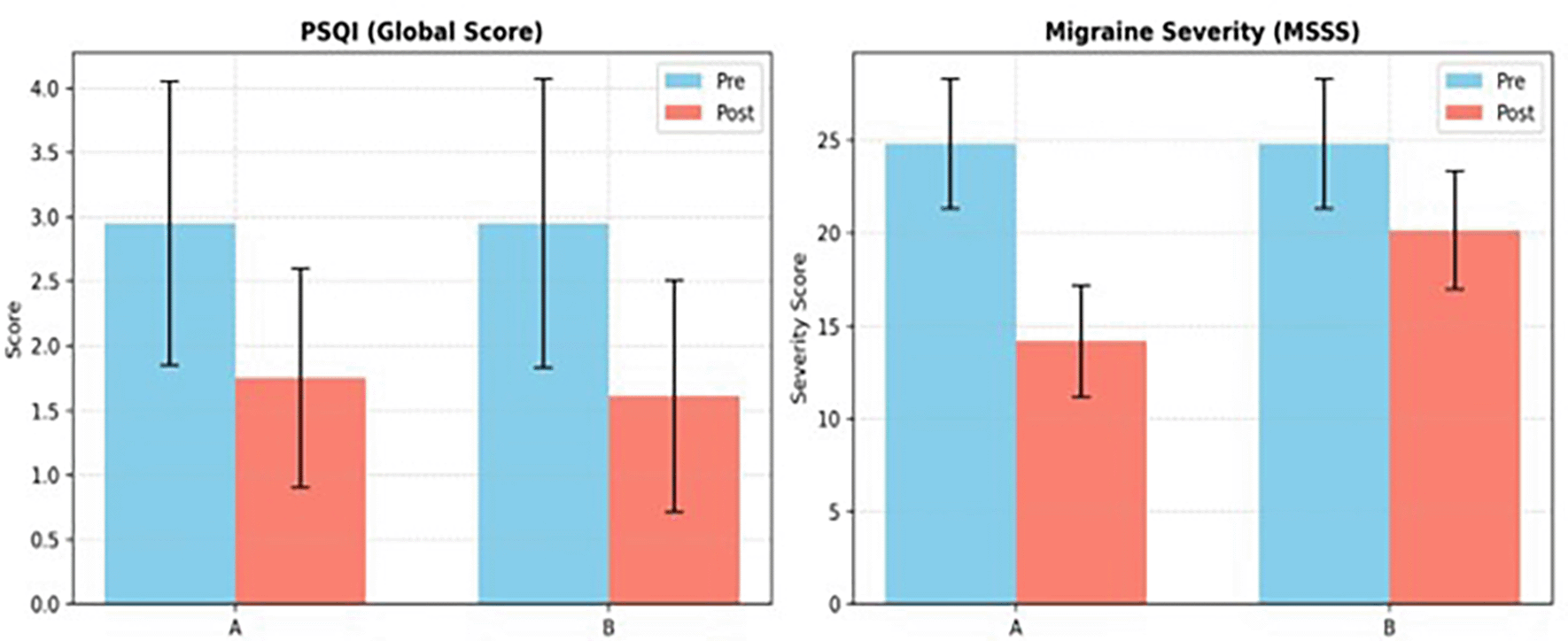 In Table 7, PSQI change across groups was not statistically significant and was minor (∆ = +0.03, 95% CI 0.28 to 0.34, p = 0.85; d = 0.03). The between-group difference in the Migraine Symptom Severity Score (MSSS) was statistically and clinically significant, with ∆ = 6.00 (95% CI 7.03 to 4.97, p < 0.001; d = 1.81). The MSSS group×time interaction was validated by mixed-effects modeling (p < 0.001), while there was no significant interaction for PSQI. Groups A and B’s pre- and post-intervention ratings for migraine symptom severity (MSSS) and sleep quality (PSQI, Global Score) are shown in Figure 8. The mean ± SD is shown by bars. While there is little difference in the quality of sleep between the two groups, Group A exhibits a larger decrease in the intensity of migraine symptoms than Group B.
