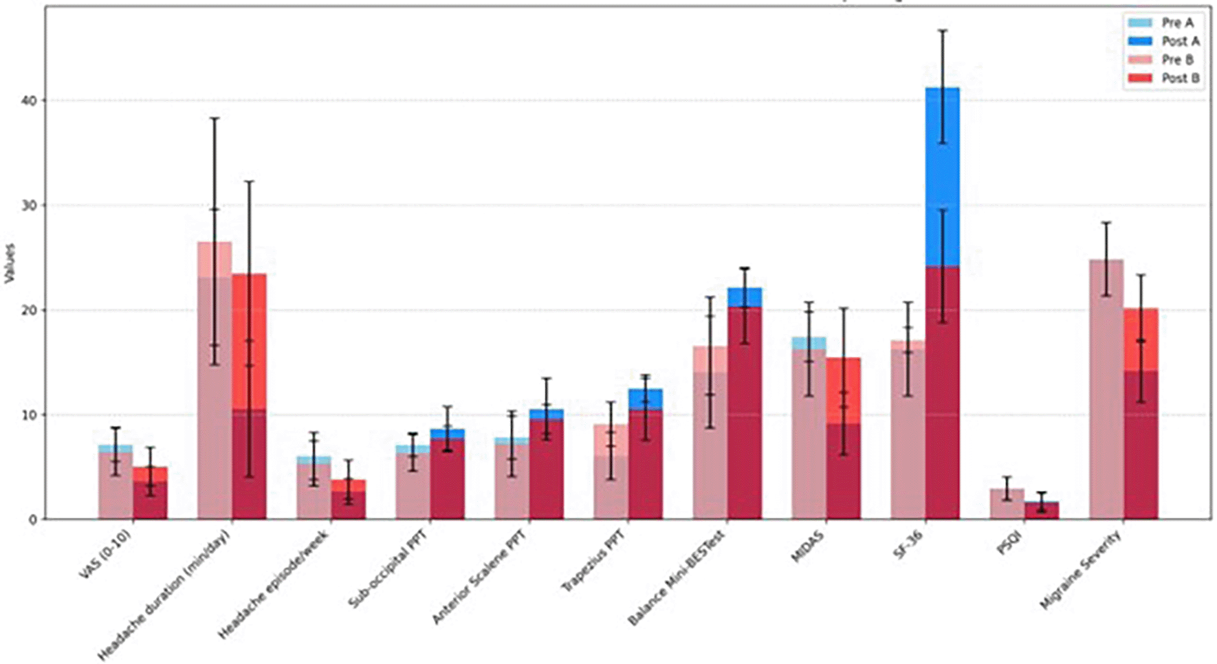 Compared with controls, GroupA demonstrated significantly greater reduction in VAS (= 2.10, p < 0.001, d = 1.15), headache frequency (∆ = 1.85/week, p < 0.001) and duration (∆ =9.45 minutes/day, p < 0.001). Significant improvements were also observed in trapezius PPT, balance (+4.30 points, p < 0.001), quality of life, dsability and symptom severity. No between-group differences was noted for the sub-occipital PPT, anterior scalene PPT and PSQI.