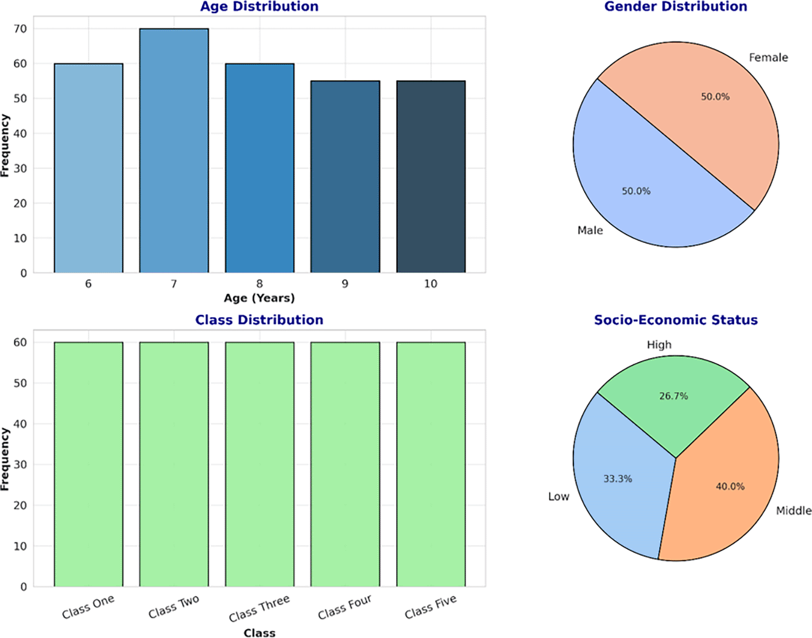 A total of 300 students participated in the study, comprising 150 boys and 150 girls from grades one to five. The inclusion criteria required that students be enrolled in one of the selected schools and have no chronic medical or developmental conditions that could affect growth. Schools were first selected using purposive sampling to ensure diversity in location and SES representation. Within each school, students were then randomly selected from classroom registers, with the goal of achieving equal representation across grades and genders. Informed written consent was obtained from all parents or legal guardians before any data were collected. Figure 1 presents the distribution of participants across school locations, grade levels, and gender, confirming balanced demographic representation in the sample.