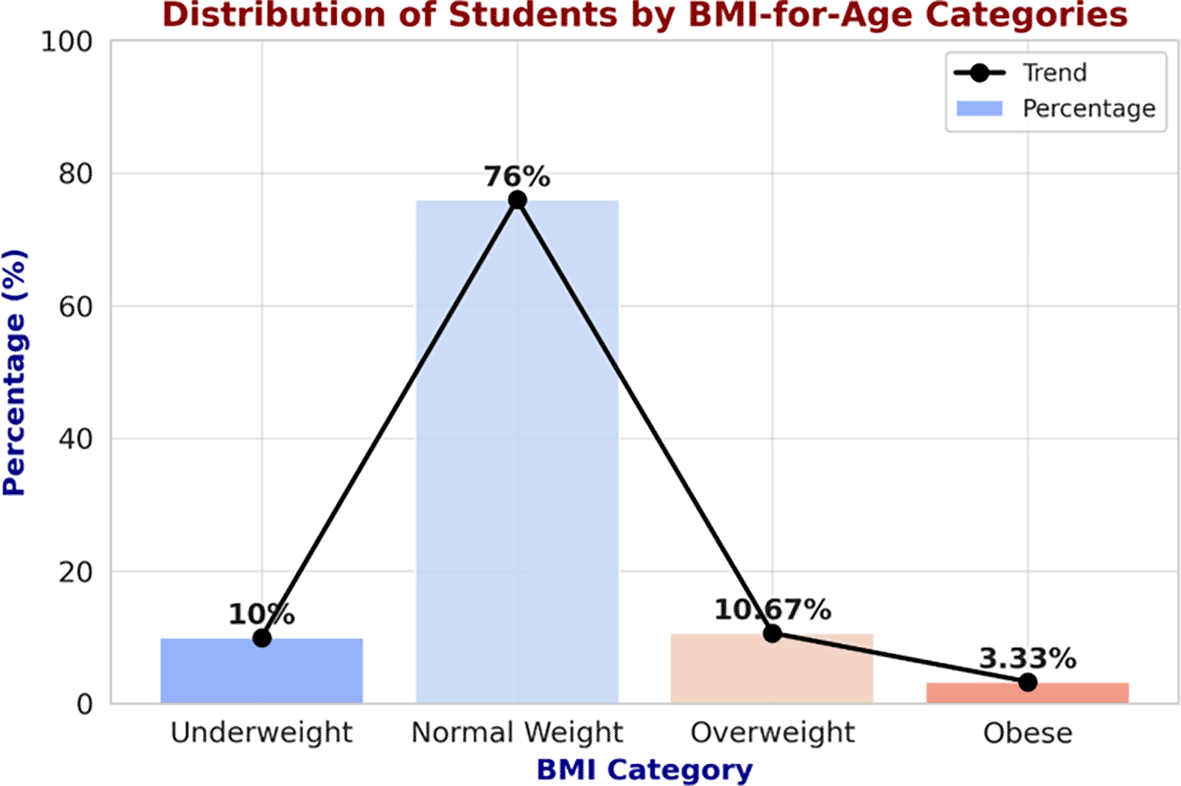 Figure 2 summarizes the distribution of students across BMI-for-age categories based on WHO standards. Most students fall within the normal BMI range, while a small proportion is classified as underweight, overweight, or obese. The majority of students (76%) fall within the normal BMI range, suggesting healthy growth. However, 10% of students were underweight, while 14% (combined overweight and obese) indicated signs of excessive weight, highlighting the need for early intervention.