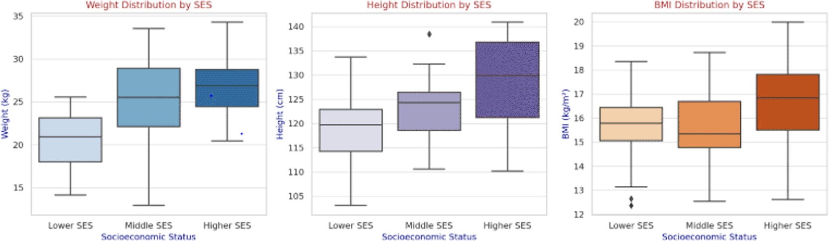 To further illustrate the disparities in weight, height, and BMI across socioeconomic groups, Figure 3 presents the distribution of these parameters using box plots. The figure reveals that lower SES students generally exhibit lower median values for weight and height, with higher variability in BMI. These trends are consistent with the ANOVA results ( Table 6) and post hoc analysis ( Table 7), which confirm significant differences between SES groups (p < 0.001). The wider spread of BMI values among lower SES students suggests greater heterogeneity in nutritional status, indicating potential risks of both undernutrition and overweight in this group.