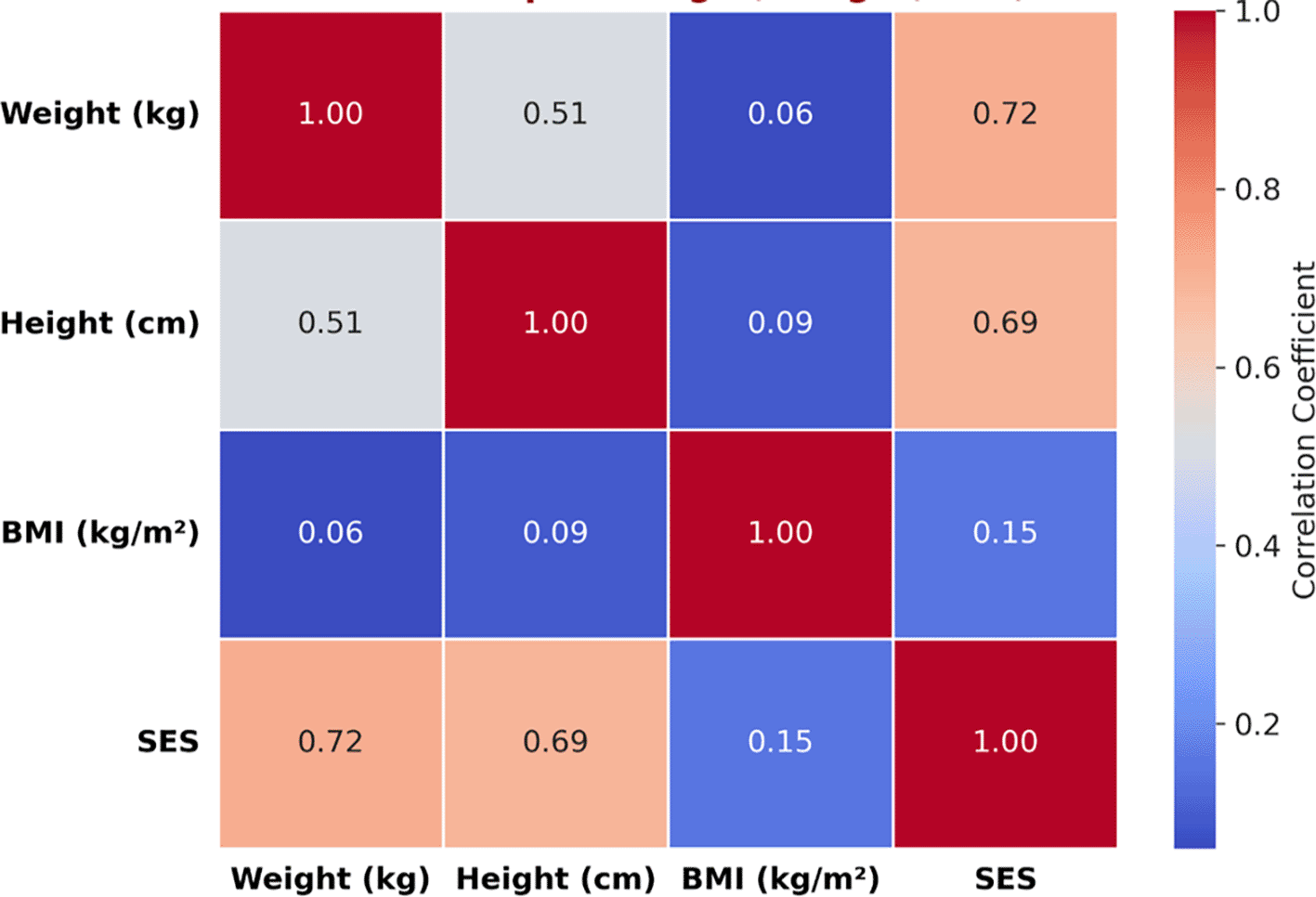 To further investigate the relationship between socioeconomic status (SES) and physical growth parameters, a correlation analysis was conducted. The heatmap ( Figure 4) illustrates the strength of associations between SES, weight, height, and BMI.