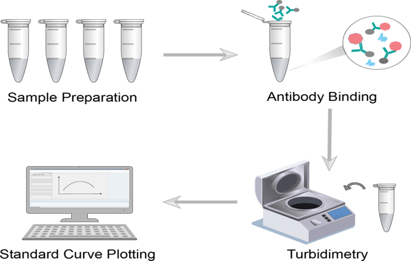 Immunoturbidimetry (IT) utilization of formation of antigen-antibody complexes, but in solution rather than in agarose gel (as shown in Figure 3).25 With the with the proper proportion of antigen and antibody, the formation of antigen-antibody complexes can be monitored through as the process requires as little as a few minutes, this technique represents the method of choice for automation of analysis, but it is only suitable for protein concentrations above 0.5 to 1.0 mg/dl (5 to 10 mg/litter). This approach is widely used in human clinical biochemistry for determination of proteins such as CRP, but the limited accessibility of appropriate reagents has held back applications in veterinary medicine. Nonetheless, IT methods for canine CRP and feline AGP have been reported.26 Although commercial kits for human CRP based on IT have been verified for use in serum from some animal species, caution has to be exercised in their application, particularly since antiserum batches may exhibit varying cross-reactivity’s toward animal proteins, resulting in batch-to-batch variation that can arise.27 Immunonephelometry is a related method where reflected rather than absorbed light is measured, which aids in reducing interference.28 An alternative adaptation of the IT test is to employ antibody-coated latex particles, which may render assays more sensitive as well as stabilizing the antibodies. An approach employing latex particles coated with antibody to human serum amyloid A has been verified to detect this protein in horses.29