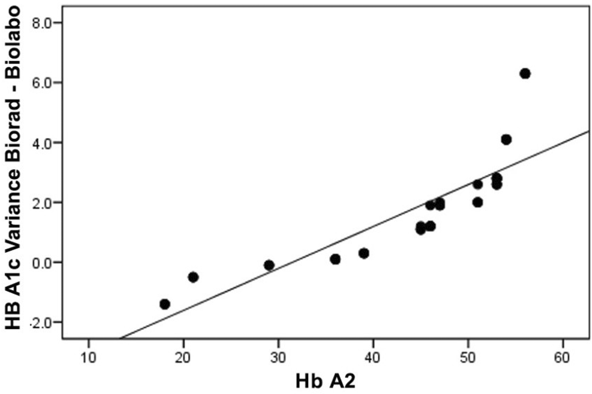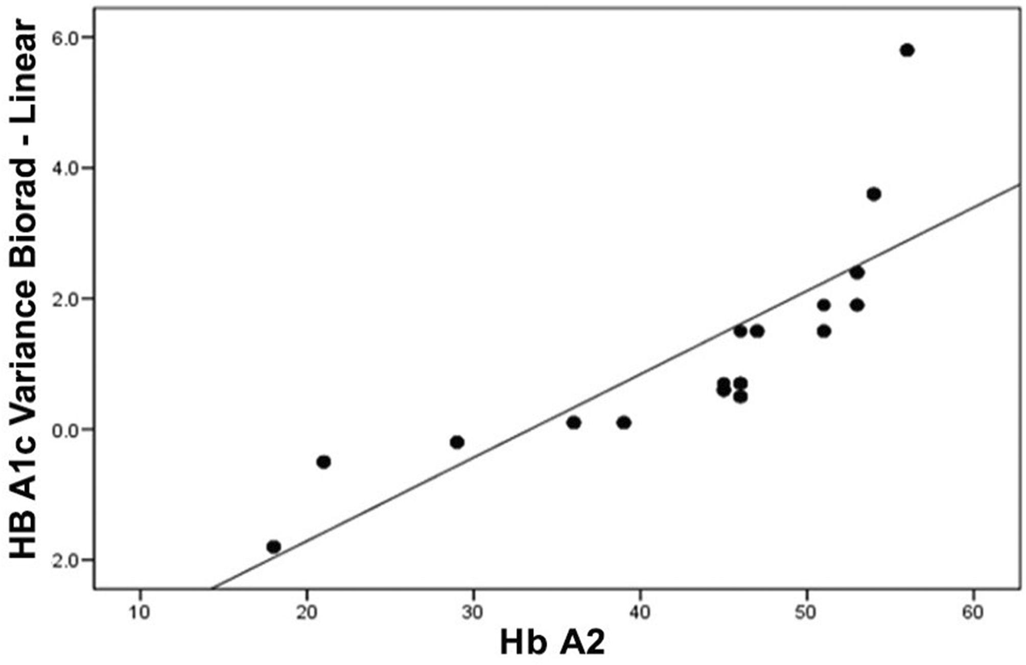 A significant statistical association was discovered between this amount of difference and hemoglobin A levels, of r = 0.856; p value <0.001 for the Biolabo approach with r = 0.826, p value <0.001 for the LINEAR method Figures 4, 5.