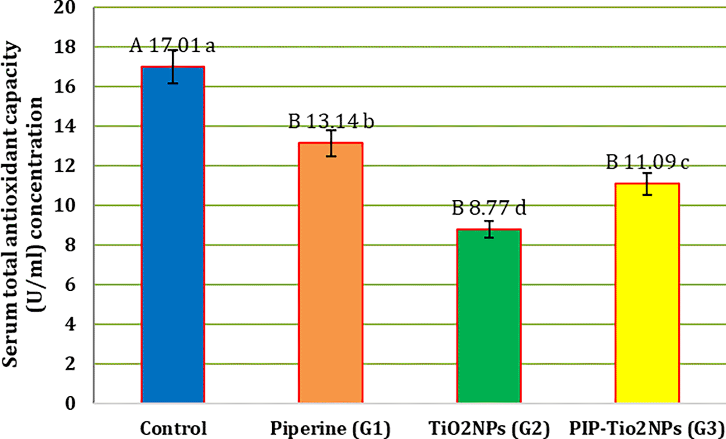 The mean serum total antioxidant capacity (TAO-C) concentration in all treated groups is shown in Figure 1. Significant (P < 0.05) increases in serum TAO-C were observed following treatment with piperine (G1) alone (A17.01±0.70a) or PIP-TiO2NPs (G3) (B11.09±0.27c) compared to TiO2NPs (G2) (B 8.77±0.15d) at the 5th weeks of experiment However, when compared with the control group (A17.01±0.70a), all treated groups exhibited a significant (P < 0.05) decrease in TAO-C levels.