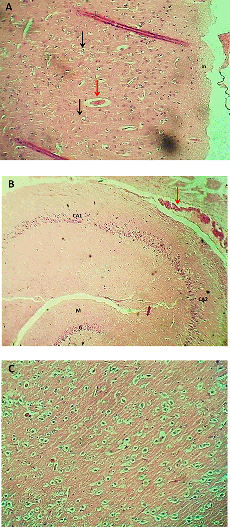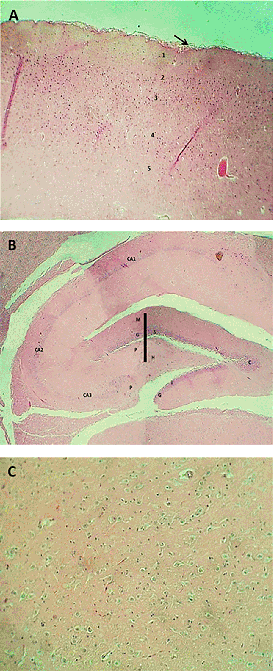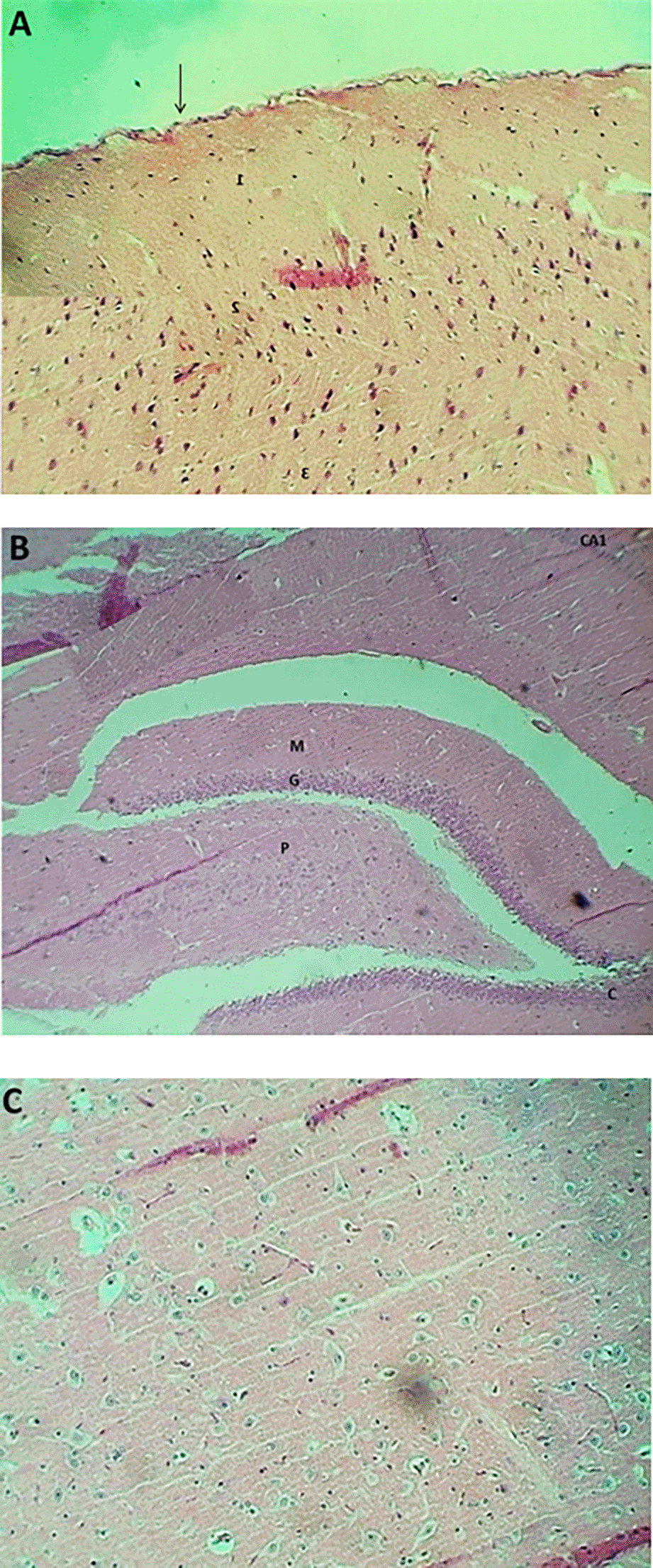 The result of the histopathological examination of the cerebral layers of the control and G1 groups (Figures 9-A and 10-A) demonstrated the typical appearance of the ganglionic, multiform, pyramidal, granular layers as well as the molecular layer, and normal glial cells with axon tracts of subcortical white matter. The hippocampus revealed a normal, distinct C-shape that reveals its layered structure, including the encompassing the Dentate Gyrus (DG) and the Cornu Ammonis (CA) areas (CA1, CA2, CA3, CA4), these areas are consistent with densely packed pyramidal neurons in the stratum pyramidale (Figures 9-B and 10-B). The thalamus also showed commonly appearing nuclei (Figures 9-C and 10-C). The histopathological results in the G2 group figures showed the cerebral layers, mild vascular congestion with little hyperplasia of glial cells within the external pyramidal cells layer, and mild demyelination of the molecular cells layer ( Figure 11-A). The figures of hippocampus showed normal neurons of CA1, two areas, normal molecular layer, granular layer, and polymorphous layer (P) of dentate gyrus, and congestion of choroid plexuses ( Figure 11-B). The thalamus also showed normal-appearing nuclei ( Figure 11-C). The G3 group histopathological figures of the cerebral layers showed normal appearance of meningeal pia mater and other cortical cerebral cell layers ( Figure 12-A). The figures of the hippocampus showed normal neurons of CA1, 2, and 3, and the figures showed moderate vaculation with glial depletion of the molecular strata of the CA1 proper hippocampus ( Figure 12-B). The thalamus also showed normal-appearing nuclei ( Figure 12-C).