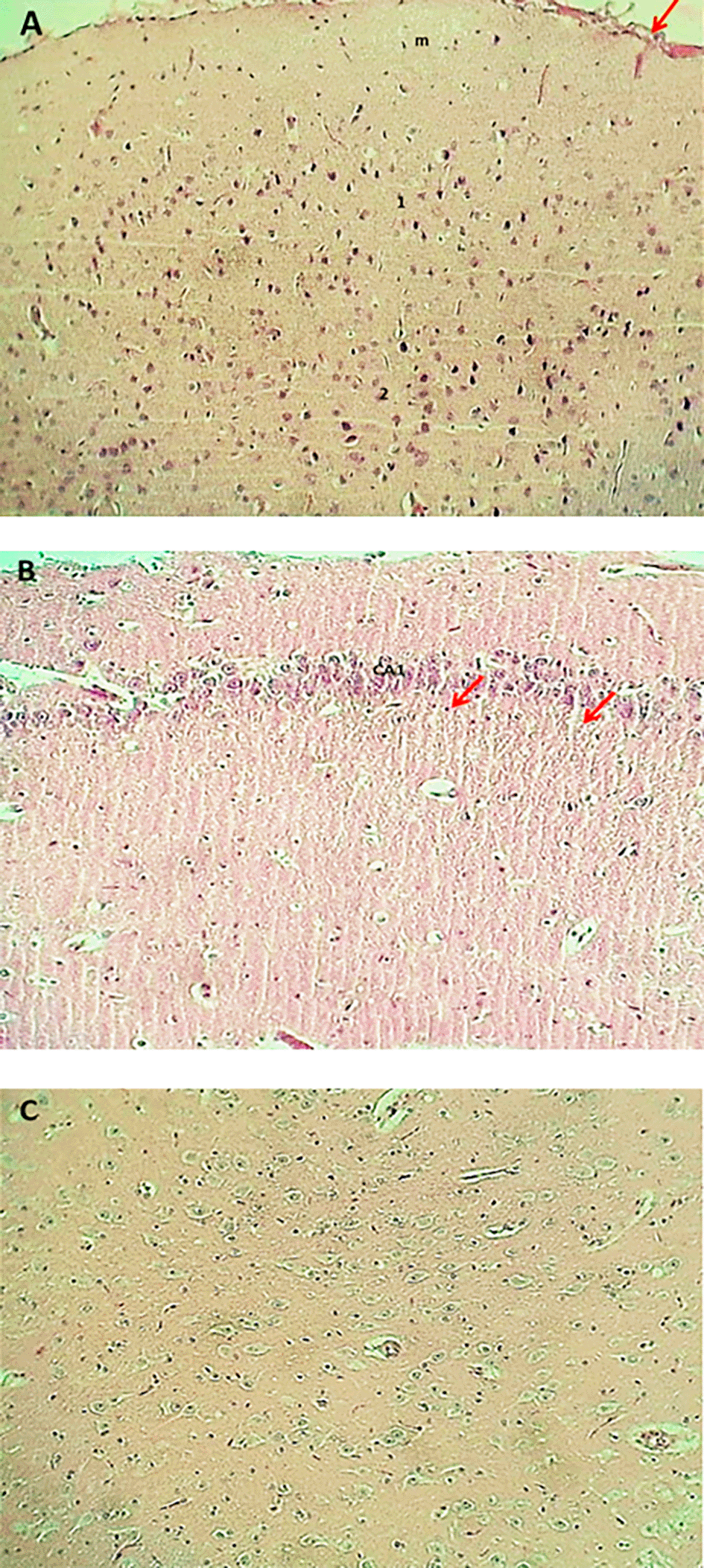 At the end of the experiment, euthanasia was performed using an overdose of anesthetic, which is an AVMA-approved method. After euthanasia, the rats remained under deep anesthesia and their brains were carefully removed from the skull for histological examination. The cerebral cortex and hippocampus were dissected, blotted, and fixed in 10% neutral buffered formalin for histological processing. Paraffin-embedded brain sections were stained with Hematoxylin-Eosin (H and E) stains according to Bancroft’s methods.42