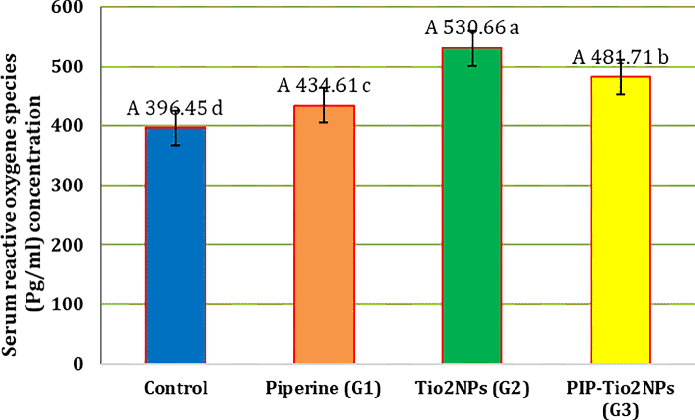 Figure 2 shows all experimental groups’ serum reactive oxygen species (ROS)levels. The G2 treatment group (intraperitoneal titanium dioxide nanoparticles at a dose of 50 mg/kg/day) showed a significant (P < 0.05) decrease in serum ROS levels (A 530.66 ± 2.19 a) compared to other treatment groups. The result also showed that treatment with G1 (orally piperine 40 mg/kg B.W) (A 434.61 ± 6.42 c) or its incorporation with G3 (i.p PIP-TiO2NPs 75 mg/kg. B.W), a significant (P < 0.05) reduction in this parameter (A 481.71 ± 10.03 b) as contrasted with the G2 treated group. In contrast, the results indicated that these groups (G1 and G3) had a significant (P < 0.05) decline as contrasted with the control group (A 396.45 ± 9.43 d), and a significant (P < 0.05) difference was also observed between G1 and G3.