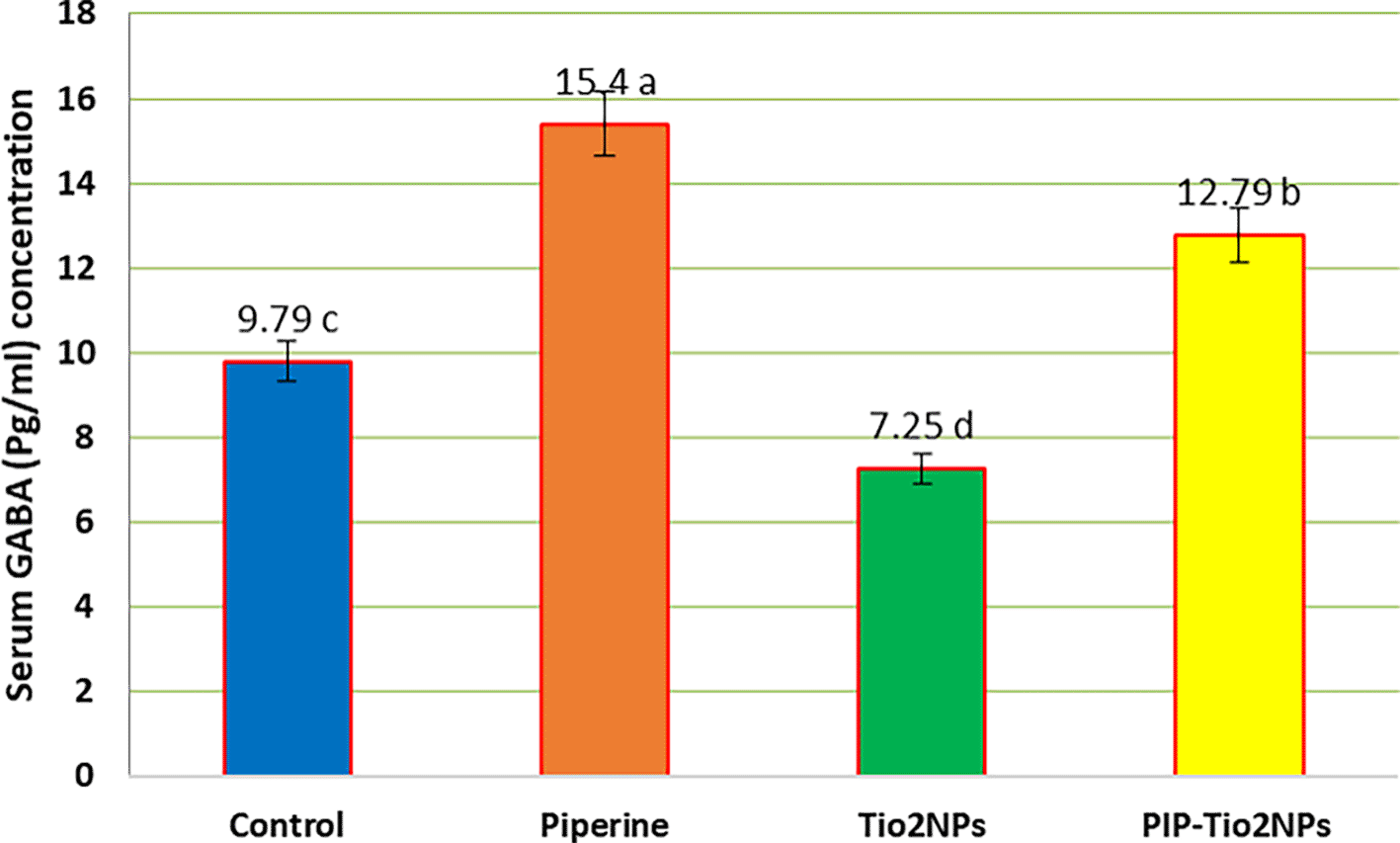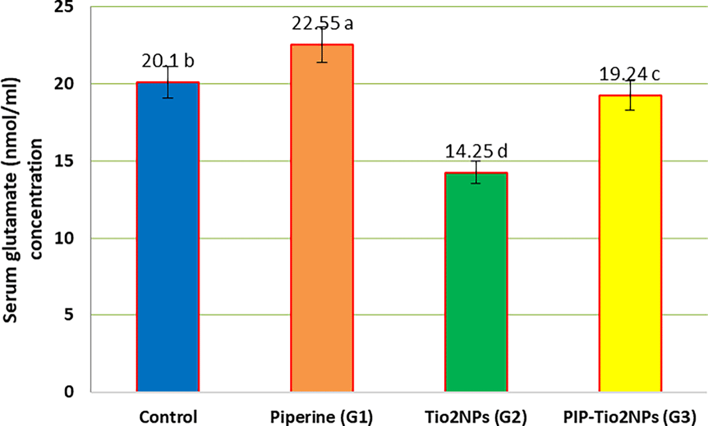 Serum neurotransmitters concentrations analysis (Glutamate, Noradrenaline and GABA) in this study confirmed a significant differences in the values of these parameters in group of rats dealt with PIP (G1) by myself or as mixture with Tio2NPs (G3), these findings imply the function of piperine or their aggregate with TiO2NPs (PIP-TiO2NPs) in attenuated the damaging effects of TiO2NPs on a few physiological mind features, these result agreed with Ref. 55 who suggested using 2.5 mg/kg/day of PIP for 4 weeks, enhanced rats’ persistent potentiation and memory test performance; chronic PIP treatment also produced more effective synaptic plasticity compared to the achieved with donepezil.66 In the meanwhile, PIP therapy for 23 days also improved neurotransmission and locomotor activity by lowering oxidative-nitrosative stress in the hippocampus and cerebrospinal fluid and improving cholinergic function in a rat model of Alzheimer’s disease (AD).14,66 Ref. 14 who documented how piperine affected the redox state of CSF and hippocampus neurones, may undoubtedly be a factor in the medication’s ability to improve cognition. Additionally, by lowering acetylcholinesterase function, a plaque, and tangles, PIP solid lipid nano-formulation enhanced blood–brain barrier permeability and increased mobility in AD mice,67 these finding agreed with results in this experiment of G3 treated rats with piperine or piperine-Tio2NPs combination (i.p PIP-TiO2NPs 75 mg/Kg. B.W) and this may be result in enhance its potentiality in some brain dysfunctions treatment as mentioned in many studies as68 indicates that PIP administration lowered lipid peroxidation and raised antioxidants in the striatum of 6-hydroxydopamine (6-OHDA)-lesioned rats69; also found that PIP usage diminished neuronal damage in the substantia nigra in rotenone-injected PD mice and generated atuophagolysosome via Akt/mTOR pathway activation; a PIP-mediated increase in protein phosphatase 2A (PP2A) improved mitochondrial injury, mitochondrial membrane permeability transition pore dysfunction, and oxidative stress.70,71 According to Ref. 72, this alteration also increased the effectiveness of PIP derivatives in activating the Nrf2/Keap1 pathway, which provided neuroprotection in the Parkinson’s disease model and subsequently regulated brain activities. In Huntington’s disease rats, PIP therapy improved motor characteristics, striatal degeneration inside the basal ganglia, and ATP production.73 PIP therapy improved serotonin stages and adjusted the glutamate, noradrenaline, monoamine oxidase, and gamma-aminobutyric acid (GABA-ergic) pathways.74 Additionally, within the brain and serum of a pilocarpine-precipitated epileptic mouse model, PIP remedy decreased nitrite and multiplied GABA, glycine, and taurine.75