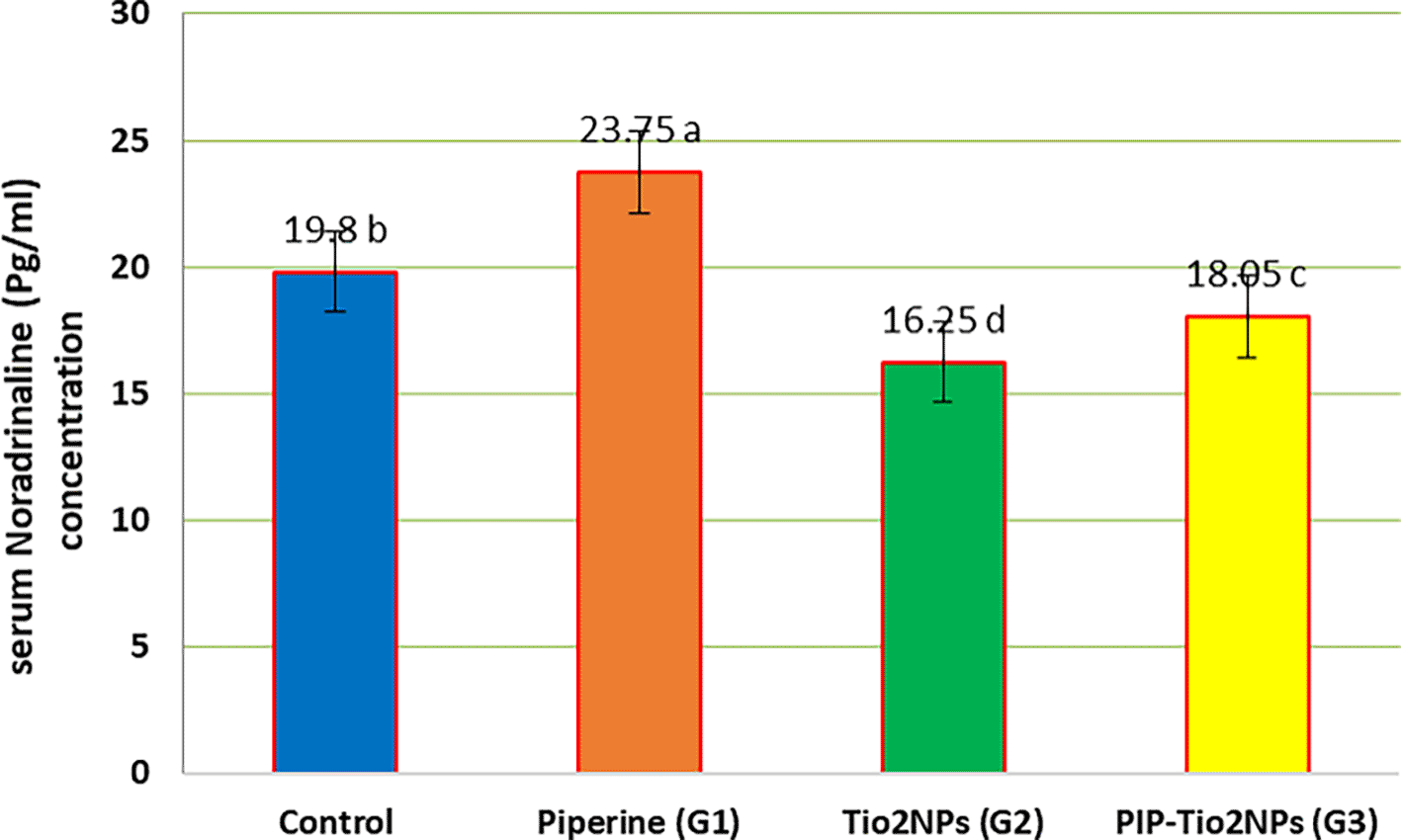 forty rats were randomly divided into four equal groups for 35 days as follow: the control group was administered DW/IP; the G1 group received 40 mg/kg B.W. of piperine orally; The G2 group was given TiO2NPs (50 mg/kg B.W.)/i.p. received; and the G3 group received 75 mg/kg B.W. /I. P. of PIP-TiO2NPs.