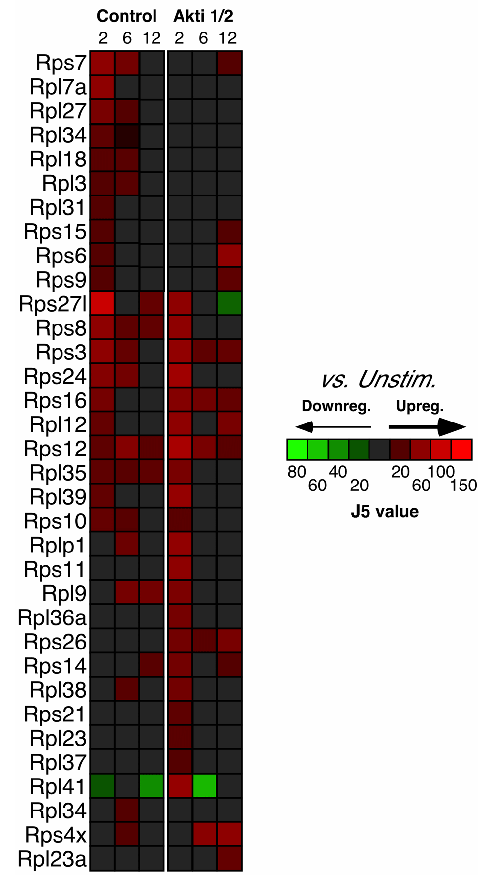 Interestingly, inhibition of Akt resulted in impaired up-regulation of the genes encoding many ribosomal proteins (Figure 3). These included: Rps6 (a major substrate of ribosomal protein kinases24); Rps8, Rps9 (reported to be activated in various tumors, such as colon cancers25); Rps10, Rps15, Rps24 (mutations in these gene result in Diamond-Blackfan anemia)26; Rpl7a (which interacts with a subclass of nuclear receptors and inhibits their ability to activate transcription)27; Rplp1 (important for elongation during protein synthesis28). All these proteins belong to either small or large subunits of ribosomes; changes in their expression may contribute to an increase in protein synthesis to accommodate numerous cellular processes involved in T cell activation, in addition to the possible connections to cancer. Importantly, the expression of 18S ribosomal genes, which was used for our qPCR housekeeping gene, did not differ between our experimental groups.