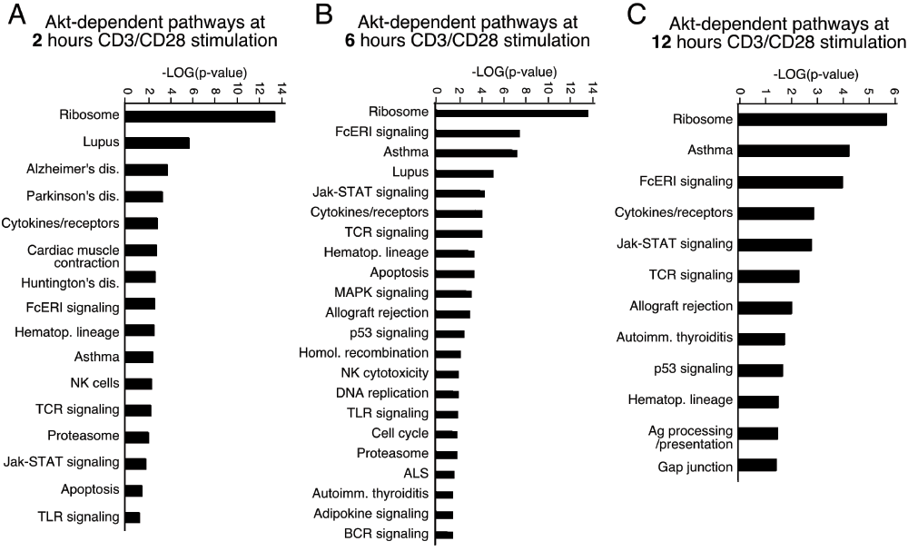 From our previously published array data, we found that at two, six and twelve hours after CD3/CD28 stimulation. Akti1/2 elicited a wide range of effects on expression of numerous genes, including both over- and under-expressed genes. In the present study, genes that showed changes in expression after two, six and twelve hours of stimulation in the presence of Akti1/2 were largely not overlapping and cannot be combined for subsequent analysis. There were 54, 71 and 58 genes dependent on Akt at the two, six and twelve hour time points, respectively, after CD3/CD28 stimulation (Data File 1–Data File 2 and Supplementary Figure 1).