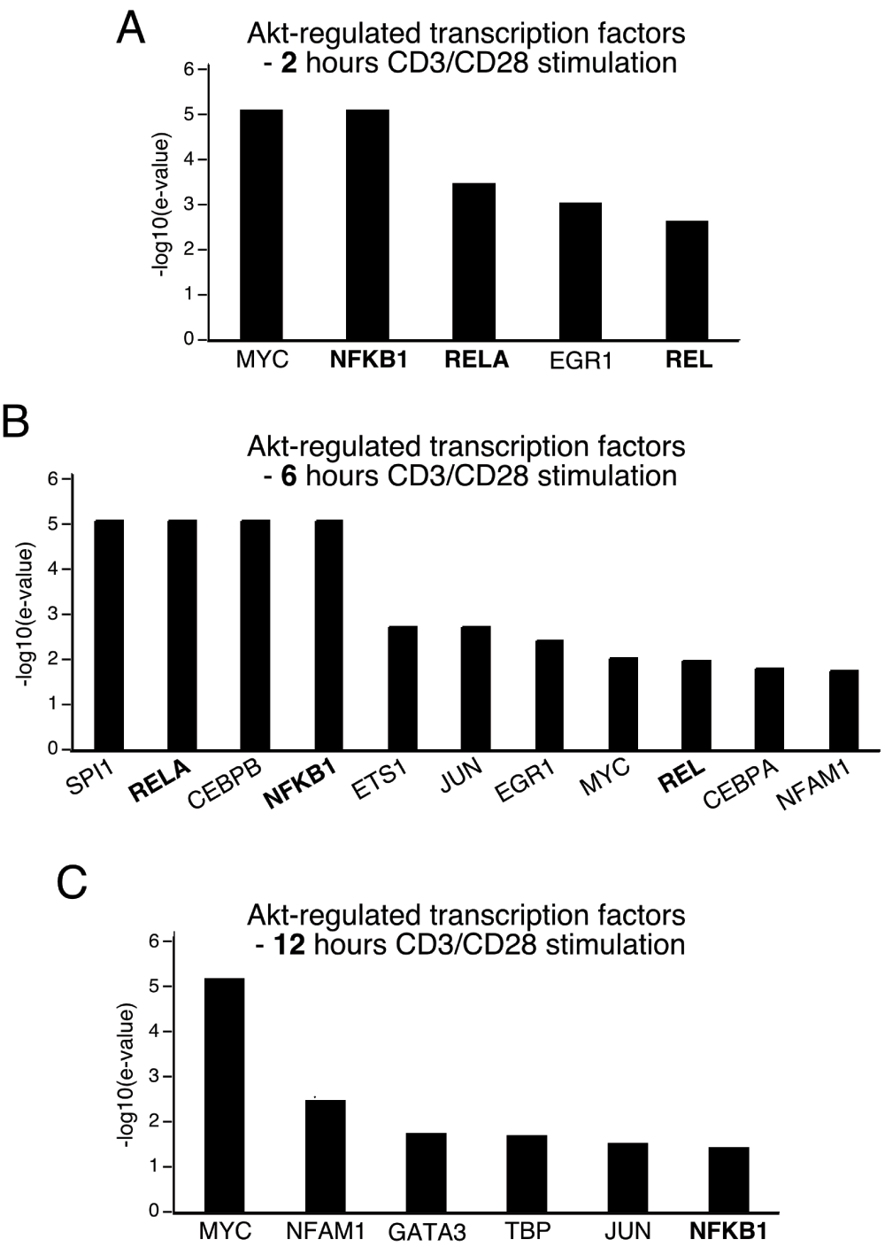 Co-expressed genes are often regulated by common transcription factors. Therefore, we separately analyzed the genes that showed altered expression at 2, 6 and 12 h time points after CD3/CD28 stimulation using TFactS, an algorithm that used a catalog of well-characterized transcription factor targets to predict the activity of transcription factors based on microarray data17. Enrichment of transcription factors was found at all the time points tested (Figure 6). These included NF-κB family members (RelA, Rel, NF-κB1), Myc, Jun and CREB. At the 2 h time point, Myc, NF-κB family members (NF-κB1, RelA and Rel) and Egr1 were significantly enriched. RelA, NF-κB1 and Rel, along with Myc and Egr1 were also significantly regulated after 6 h of CD3/CD28 stimulation. Moreover, other transcription factors, including Sp1, CEBPB, Ets1, Jun and Nfam1, were also enriched at the 6 h time point. At 12 h after stimulation, however, fewer transcription factors were regulated, with Myc and NF-κB1 still significantly regulated. In summary, the most significantly enriched transcription factor binding sites in the regulatory regions of Akt-dependent genes after CD3 and CD28 stimulation were those of NF-κB family members and Myc.