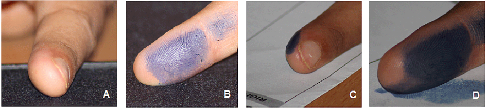 A and B show the rolling of the finger from the radial side to ulnar side on an ink pad. C and D show the transference of fingerprints onto the allocated area of the paper.