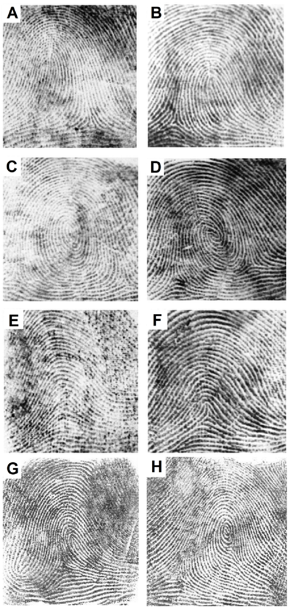 A: Ulnar loop, B: Radial loop, C: Plain Whorl, D: Double loop whorl, E: Plain arch, F: Tented arch, G: Accidental whorl, H: Central pocket loop.