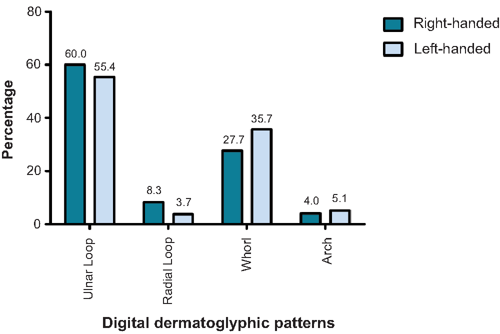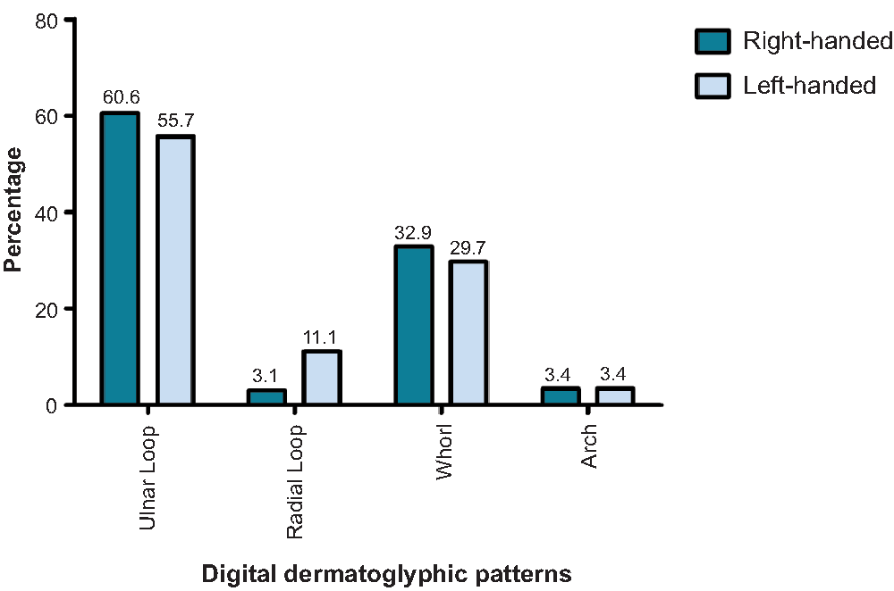 Coren (1994)11 in his study on Canadians found that left-handers were more likely to have arches and radial loops, while fewer whorls than right-handers. The correlation of handedness and digital dermatoglyphics was most marked on the left hand, which showed significant differences on four digits except digit 1. On the right hand, handedness was associated with a digital dermatoglyphics patterns only on digit 4.
