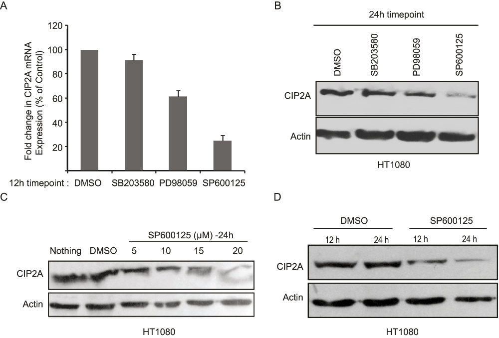 A. qRT-PCR showing the effect of small molecule inhibitors against the p38 (SB203580), MEK-ERK (PD98059) and JNK (SP600125) pathways on CIP2A mRNA expression (12h timepoint; Shown is mean values ± S.D., of representative results from three independent experiments. Student T-test was used obtain the statistical significance value) B. Western blot showing the effect of small molecule inhibitors against the p38 (SB203580), MEK-ERK (PD98059) and JNK (SP600125) pathways on CIP2A protein expression (24h timepoint). Shown is the representative picture of two independent experiments. C and D. Effect of small molecule inhibitors against JNK (SP600125) pathway on CIP2A protein expression in concentration (C) and time (D) dependent manner. Shown is the representative picture of two independent experiments.
