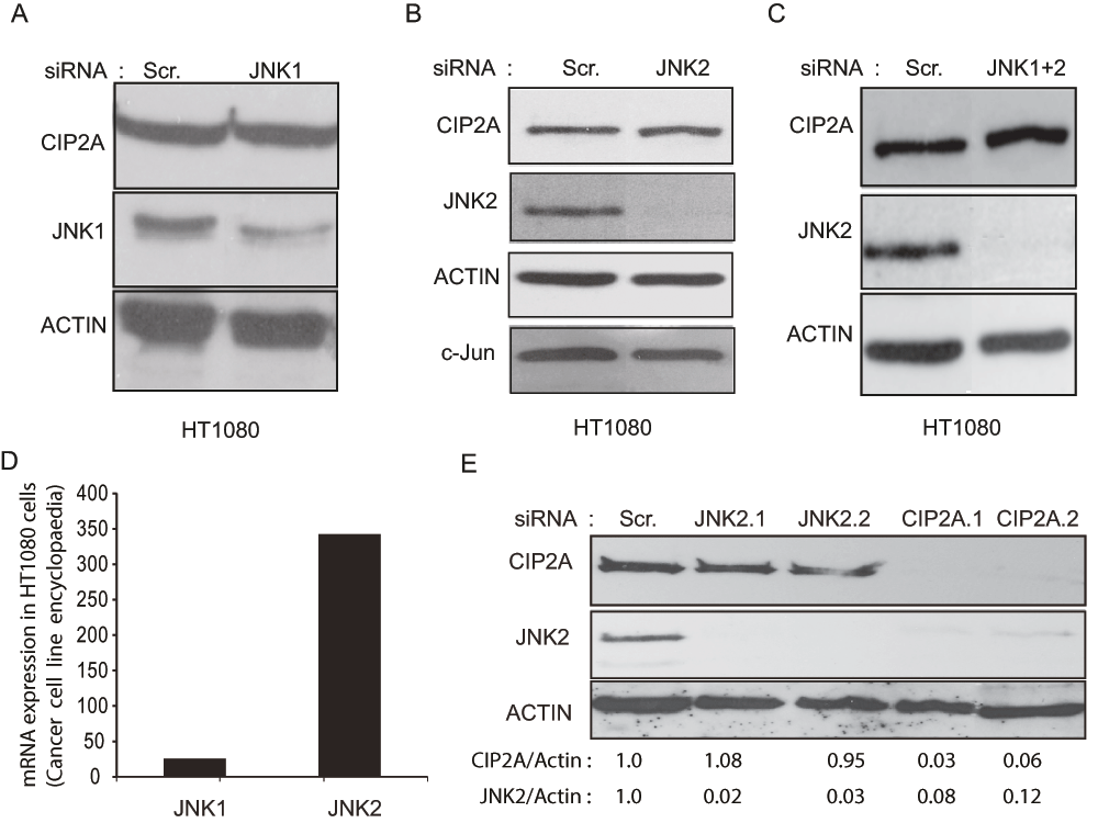 SP600125-mediated inhibition of CIP2A expression suggested the involvement of the c-Jun N-Terminal Kinases (JNKs) in regulation of CIP2A expression in HT1080 cells. Since the JNK3 isoform is well known to be neural-specific23, specific validated siRNAs against JNK1 and JNK2 isoforms were transfected into HT1080 cells and CIP2A expression estimated. Although, both JNK1 and JNK2 siRNAs reduced their target proteins (JNK1 and JNK2 respectively), there was no change in CIP2A protein expression with either of them individually (Figure 2A and B) or in combination (Figure 2C). Since the JNK2 isoform is expressed more than 10-fold higher than the JNK1 isoform in the HT108022 (Figure 2D) cell line we transfected two validated and specific siRNAs against JNK2. In addition, we also transfected the HT1080 cells with two different CIP2A siRNA as positive controls. In line with our previous observation (Figure 2B and C), the two different siRNAs for JNK2 knocked out JNK2 expression (Figure 2E), while CIP2A expression remained unaltered. Surprisingly, two different CIP2A siRNA, which worked well as positive controls, efficiently decreased JNK2 expression (Figure 2E).