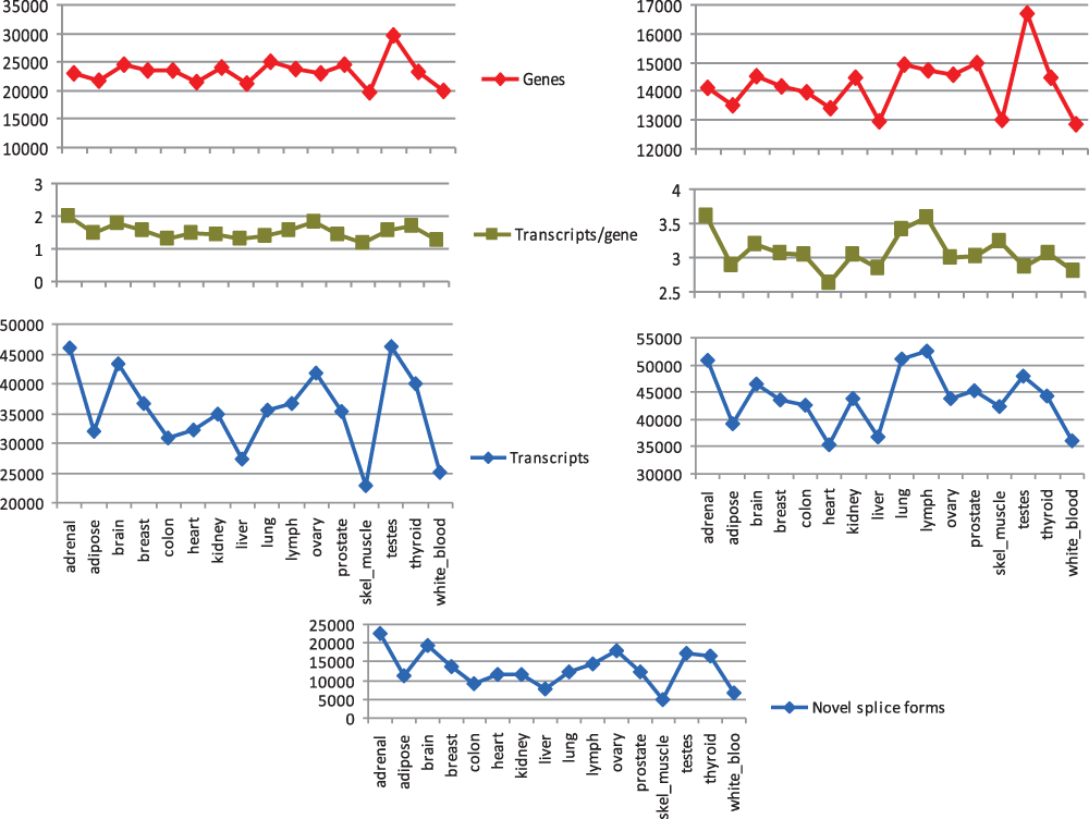Figure 1. A high-level view of alternative splicing in sixteen human tissues: numbers of multi-exon ‘genes’ and transcripts from de novo transcript assemblies produced by Cufflinks (left), and by Cuffcompare (right).