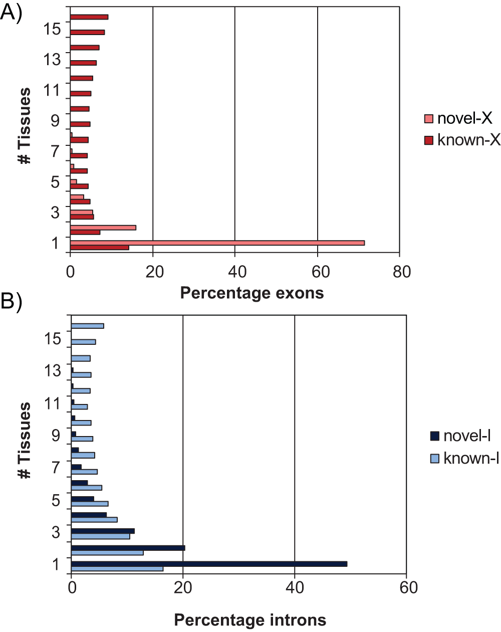 (A) The percentage of exons found in 1, 2, …, 16 tissues are shown as horizontal bars, for the 2,914 novel exons (‘novel-X’) and 24,075 known exons (‘known-X’). (B) Similarly for the 15,958 novel introns (‘novel-I’) and 11,031 known introns (‘known-I’).