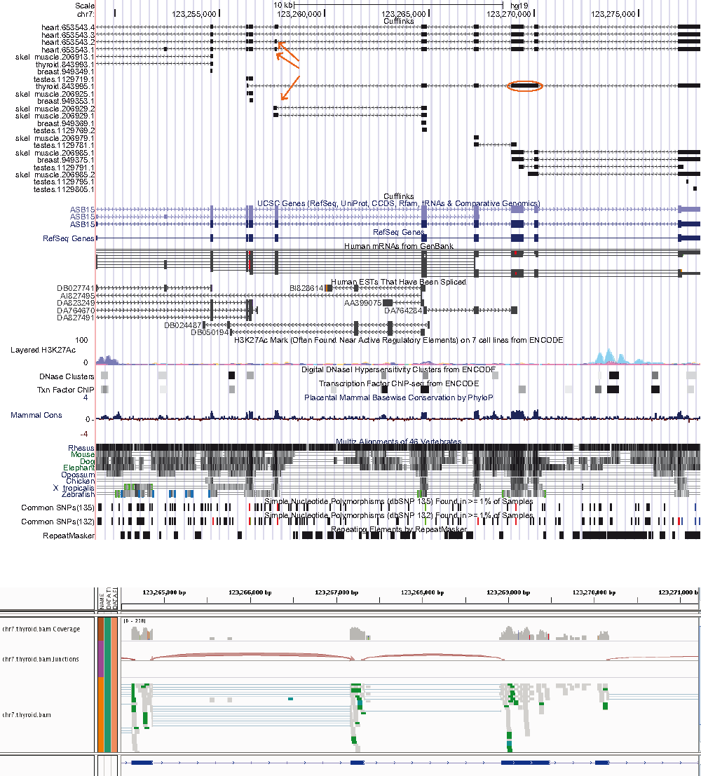 Another novel event occurs in the gene ASB15 (ankyrin repeat and SOCS box containing 15) (Supplemental Figure S10). Human ASB15 is known to be expressed predominantly in skeletal muscle and to participate in the regulation of protein turnover and muscle cell development by stimulating protein synthesis and regulating differentiation of muscle cells. Bovine ASB15 mRNA was also found in heart and pituitary gland tissue, and rat ASB15 was additionally present in kidney and lung tissue, but the amount in most other tissues analyzed was scarce32. These results are consistent with the Illumina Human Body Map data set. Here, exon chr7:123,257,633–123,257,718 is a novel shorter variant that shares its 5´ end with the annotated exon. Both the exon-containing and the exon skipping form are expressed in heart, and have strong read support in the 16 tissues (136 and 39 reads supporting the flanking introns, and 30 reads spanning the exon). Evidence for the novel splice junction is also present in skeletal muscle tissue. We also found a novel putative intron retention event (chr7:123269489–123270019, 531 bp) whose sequence is conserved across multiple vertebrate species. Overall, our analyses underscore the vast potential for RNA-seq experiments to unearth novel splicing events and isoforms.