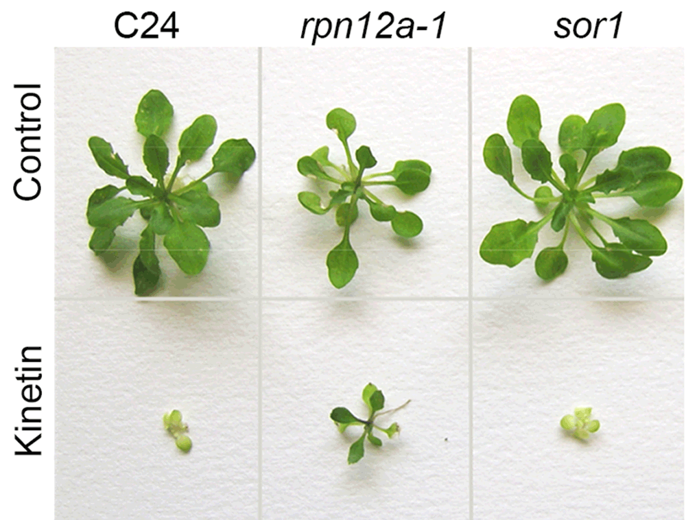 Analyses of the M3 generation showed that in suppressor of rpn12a-1 1 (sor1), all visible phenotypes of rpn12a-1 were reverted back to the wild-type (Figure 1). For example, the rpn12a-1 mutant has a smaller rosette than the wild-type and a reduced leaf initiation rate15. The sor1 plants had a leaf number and rosette size similar to the C24 wild-type plants (Figure 1). The sor1 mutant plants also displayed wild-type sensitivity to cytokinin. After three weeks of growth on a medium with 0.2 µM kinetin, both wild-type and sor1 seedlings were chlorotic and their growth was severely inhibited, while the rpn12a-1 seedlings were green and larger (Figure 1).