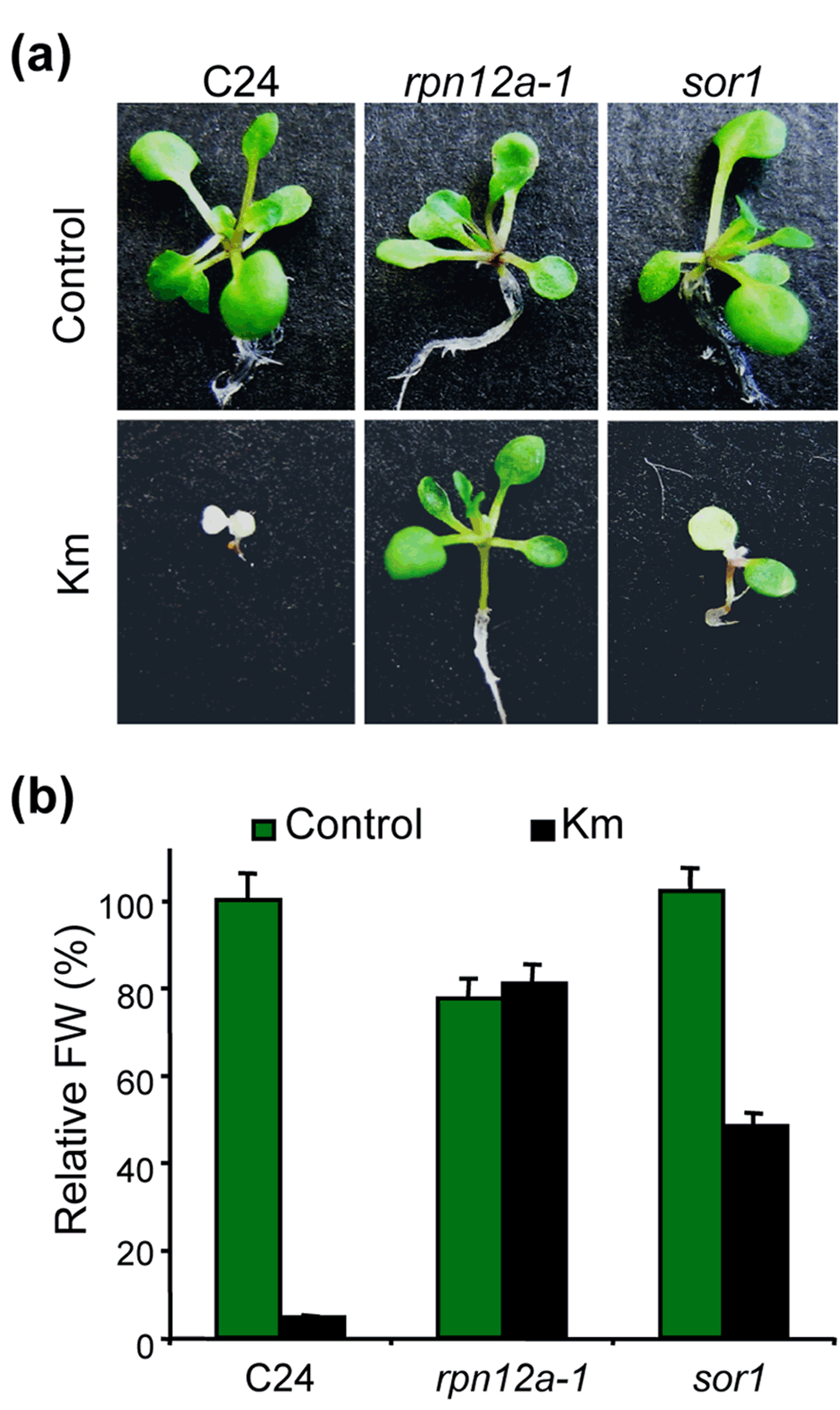 (a) Wild-type (C24), rpn12a-1 and sor1 seeds were sown and grown on MS/2 media containing 35 µg/ml kanamycin (Km). Representative plants were photographed after two weeks of growth. (b) Fresh weight (FW) of seedlings grown on Km media was measured after two weeks of growth. FW of the wild-type plants grown on control MS/2 media was calculated as 100%. Seedlings were measured in pools of five, and mean ± SD is presented (n≥7).