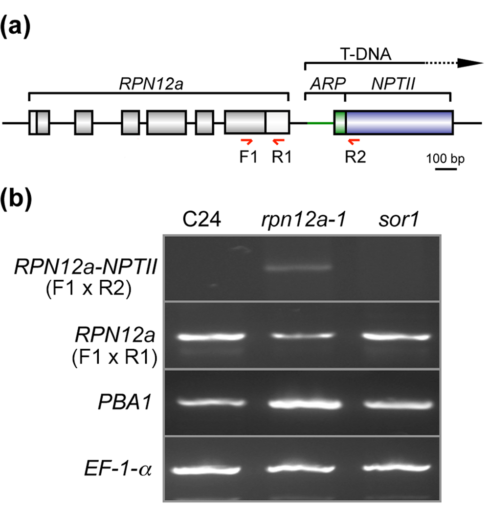 (a) Simplified schematic representation of the RPN12a gene and the inserted T-DNA in the rpn12a-1 mutant15. The T-DNA contains the first intron and second exon of the apurinic endonuclease gene (ARP) fused in frame to the neomycin phosphotransferase II (NPTII) coding region. Exons are represented by gray boxes and introns as lines. Positions of the forward (F1) and reverse (R1 and R2) primers used for the RT-PCR are indicated. (b) Total RNA was extracted, reverse transcribed and used to amplify the RPN12a-NPTII (42 cycles) and wild-type RPN12a transcripts (35 cycles). The primers used for the reaction are indicated. Amplification of proteasome β subunit 1 (PBA1) and ACTIN2 serve as controls.