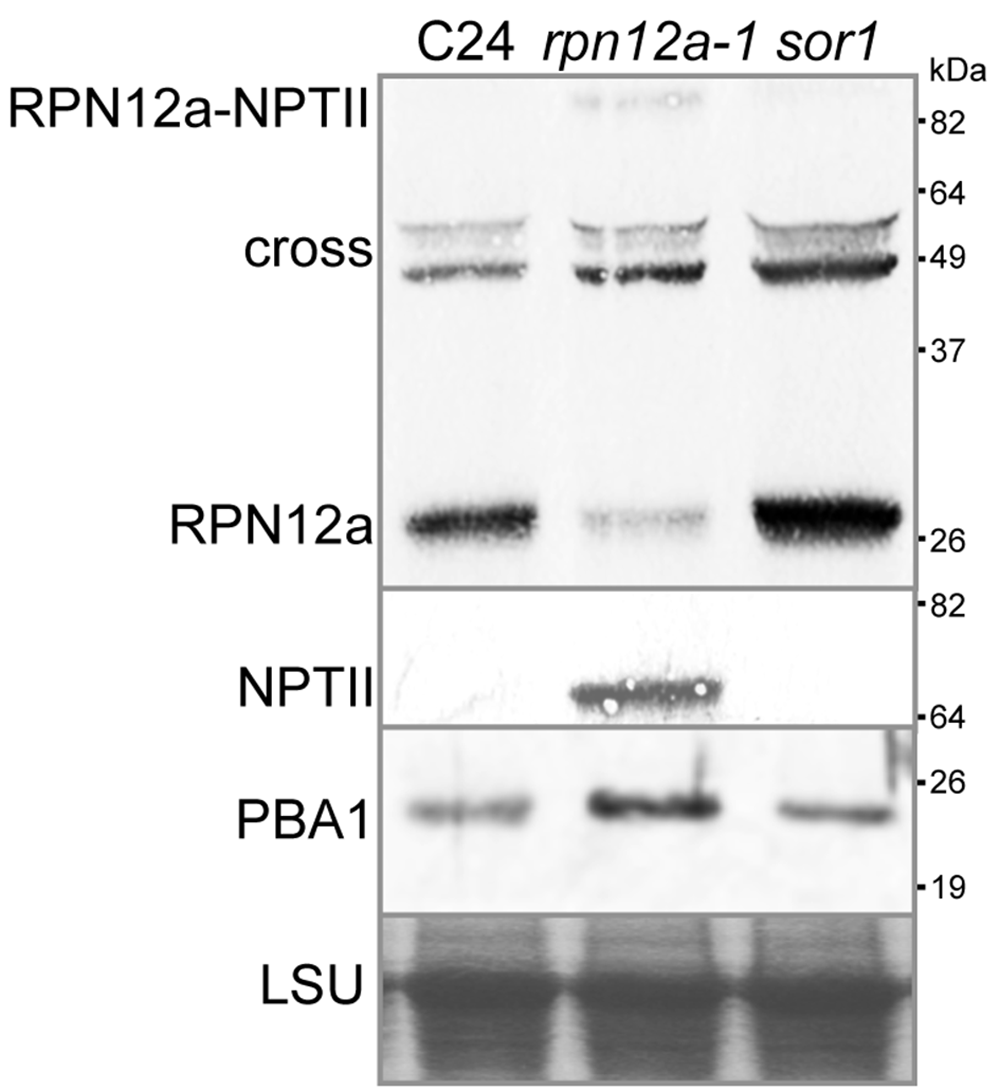 Total protein was isolated from two-week-old wild-type (C24), rpn12a-1 and sor1 seedlings and used for immunoblotting analyses with anti-RPN12, anti-NPT and PBA1 antisera. In addition to the RPN12a and RPN12a-NPTII fusion proteins, the anti-RPN12 antisera also recognized two proteins (cross) that are not related to RPN12a. Ponceau S-stained membrane showing the large RuBisCO subunit (LSU) is presented as a loading control. The size of the proteins used as molecular mass standards is shown on the right-hand side.