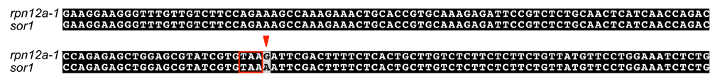 Genomic DNA fragment was amplified using F1 and R2 primers (presented in Figure 3), sequenced and the sequence was aligned using Vector NTI suite. Alignment of the region starting with base pair 1615 and ending with base pare 1804 of the annotated RPN12a gene is presented using BoxShade 3.2. The red arrowhead points to the sor1 mutation and the RPN12a STOP codon is boxed in red.
