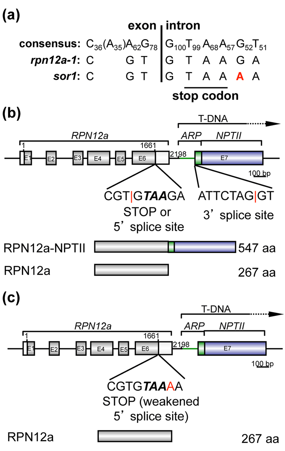 (a) Sequence alignment of the terminal exonic tetranucleotides and proximal intronic hexanucleotides of the Arabidopsis consensus sequence27, and rpn12a-1 and sor1 sequences surrounding the STOP codon. Numbers next to the nucleotides of the consensus sequence refer to the frequency (%) for the noted nucleotide to be found at a given position. (b), (c) Schematic representations of splicing types in rpn12a-1 (c) and sor1 (d). aa, amino acids.