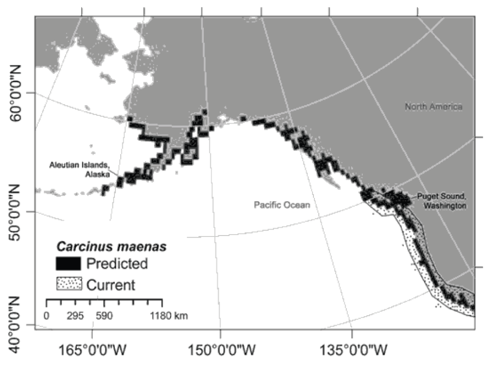 The current nonnative distribution along the coast is indicated by a broad, stippled polygon, while the potential distribution of the species is plotted in black. Figure and Maxtent potential distribution model from deRivera et al.83, figure altered to clarify the absence of C. maenas from Puget Sound. This figure has been adapted and reproduced with kind permission from Diversity and Distributions, © 2011.