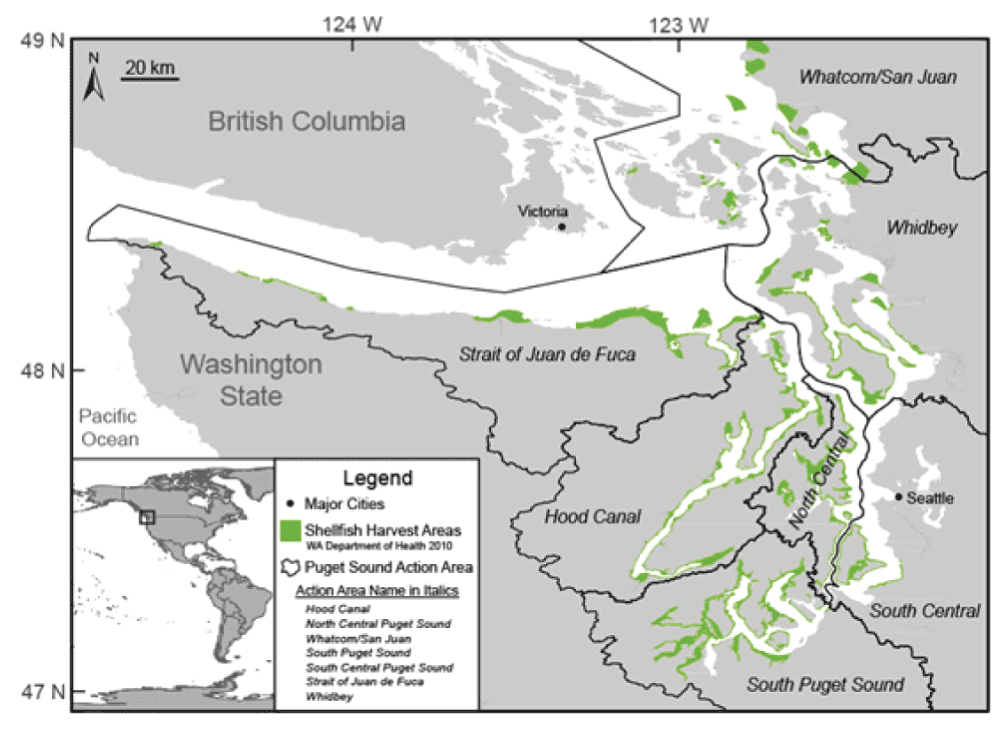We would like to thank the following scientists for their help and expertise: Dr Robert Ahrens, University of British Columbia, provided expertise in developing the model and sensitivity analysis; Mark Plummer, National Oceanic and Atmospheric Administration, provided shellfish aquaculture and shellfish harvest area data for Puget Sound; Scott Kellogg, Washington State Department of Health, provided 2010 commercial shellfish growing area ArcGIS data; and Jon Bridgman, Puget Sound Partnership, provided Puget Sound Action Areas ArcGIS data.