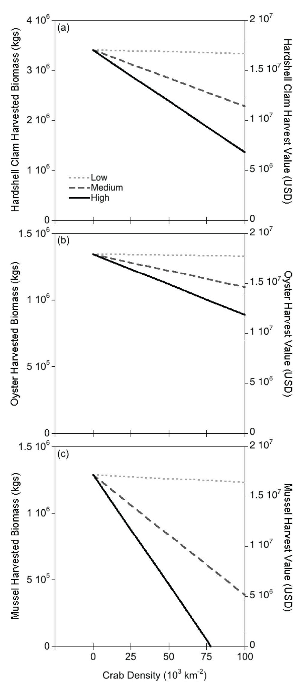 Mean harvested shellfish biomass (kgs) and revenue (USD) at increasing levels of green crab densities for three shellfish species groups: a) hardshell clams, b) oysters, c) mussels at three increasing levels (dotted light grey, low; dark grey dashes, medium; black solid line, high) of calories consumed by each green crab year-1.