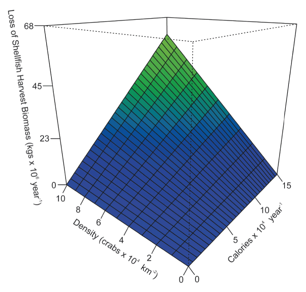 The Monte Carlo sensitivity analysis demonstrated the relationship between density and calorie consumption rate on projected loss of shellfish harvest biomass (Figure 4). If crabs invade at high densities but consume calories at a low rate, or vice versa, they would likely have a limited effect on shellfish harvest. However, at high densities and high calorie intake rates the slope of the shellfish harvest loss is steep and green crab will likely greatly reduce shellfish harvest biomass.