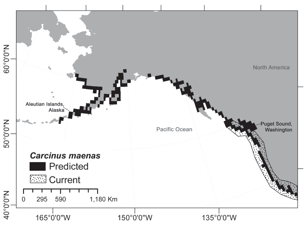 The current nonnative distribution along the coast is indicated by a broad, stippled polygon, while the potential distribution of the species is plotted in black. Figure and MaxEnt potential distribution model from deRivera et al.83, figure altered to clarify the absence of C. maenas from Puget Sound. This figure has been adapted and reproduced with kind permission from Diversity and Distributions, © 2011.