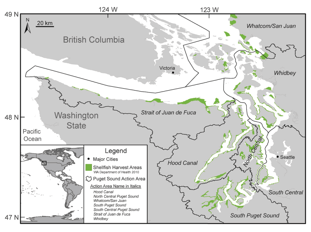 We would like to thank the following scientists for their help and expertise: Dr. Robert Ahrens, University of British Columbia, provided expertise in developing the model and sensitivity analysis; Mark Plummer, National Oceanic and Atmospheric Administration, provided shellfish aquaculture and shellfish harvest area data for Puget Sound; Scott Kellogg, Washington State Department of Health, provided 2010 commercial shellfish growing area ArcGIS data; and Jon Bridgman, Puget Sound Partnership, provided Puget Sound Action Areas ArcGIS data. Our manuscript was greatly improved by reviews from Dr. Ryan Chisholm and Dr. Nicholas Bax.