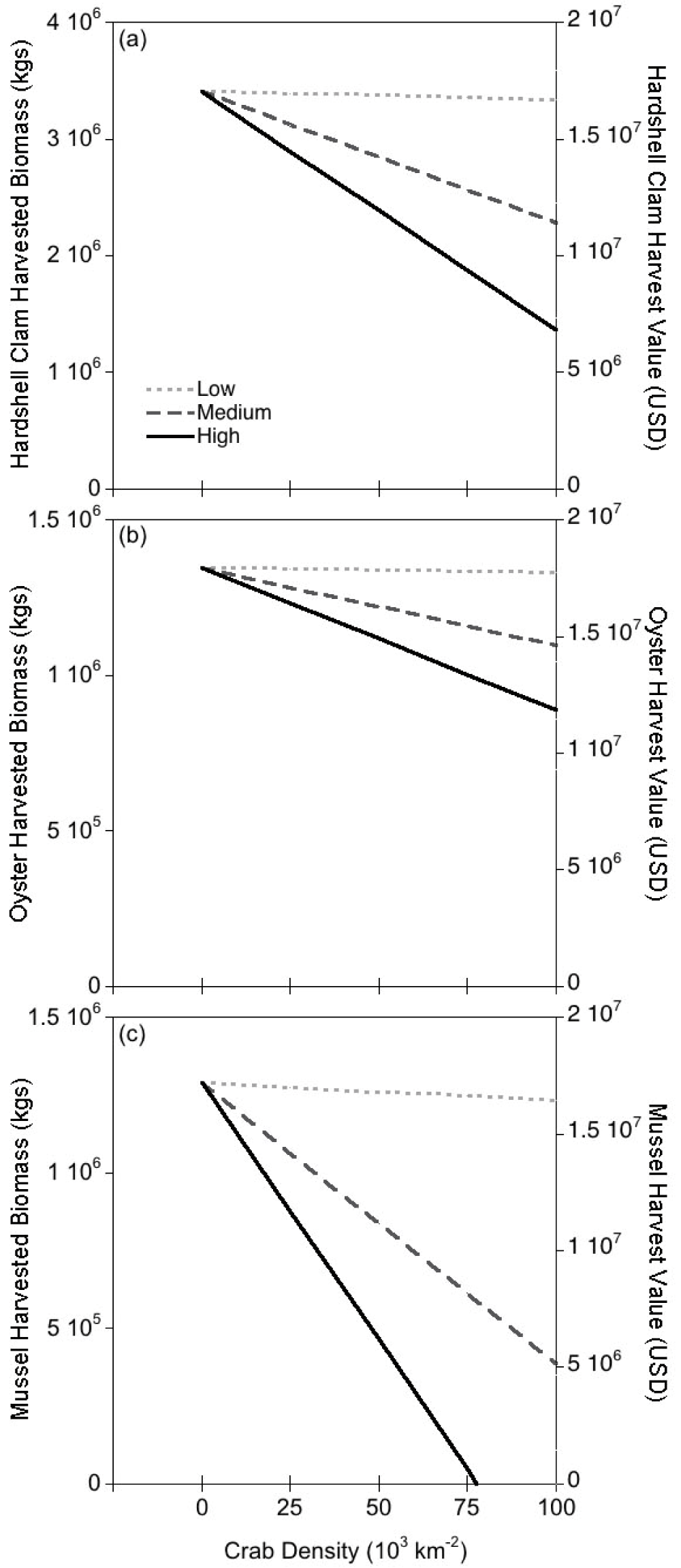 Using the consumption model, we estimated harvested shellfish biomass and total shellfish harvest revenue associated with scenarios of low, medium and high calorie diets and densities for green crab: the medium-medium (Cal-Den) scenario yielded a value-at-risk estimate of 0.54 million kg and $3.72 million USD in harvest revenue, a loss of 9.0%; the low-low scenario suggested a minor loss of only 0.04 million kg and $0.08 million USD, a loss of 0.3%; and medium-high, high-medium, and high-high scenarios suggesting losses of at least 0.99 million kg and $6.76 million USD (Table 3 and Figure 3). Mussels were the only shellfish to reach an estimated value loss of 100% for the high-high scenario (Figure 3c). Note that these losses pertain to losses of harvested biomass, not of all prey organisms, allowing for the possibility that green crab might eliminate harvestable biomass without causing local extirpation (see Discussion).