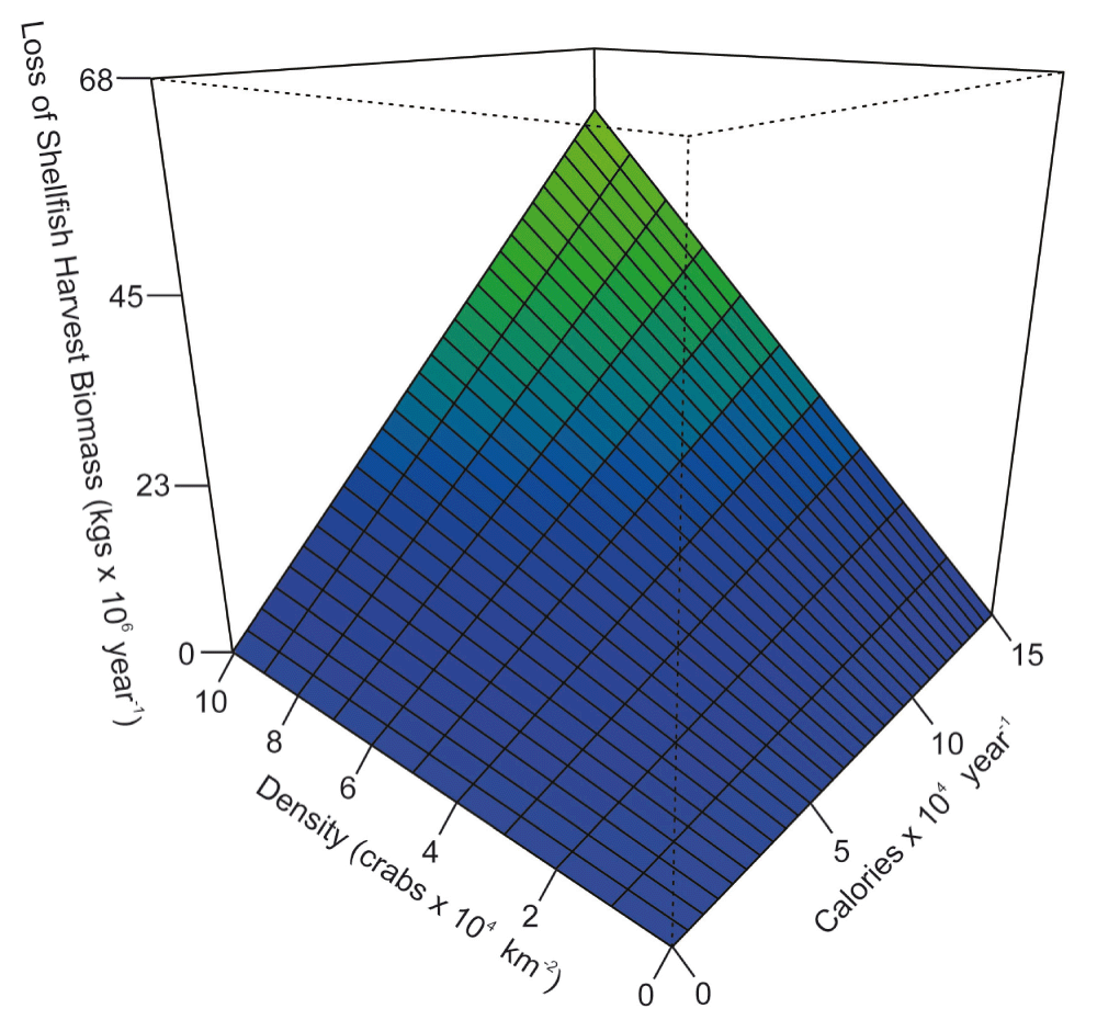The Monte Carlo sensitivity analysis demonstrated the relationship between density and calorie consumption rate on projected loss of shellfish harvest biomass (Figure 4). If crabs invade at high densities but consume calories at a low rate, or vice versa, they would likely have a limited effect on shellfish harvest. However, at high densities and high calorie intake rates the slope of the shellfish harvest loss is steep and green crab will likely greatly reduce shellfish harvest biomass.