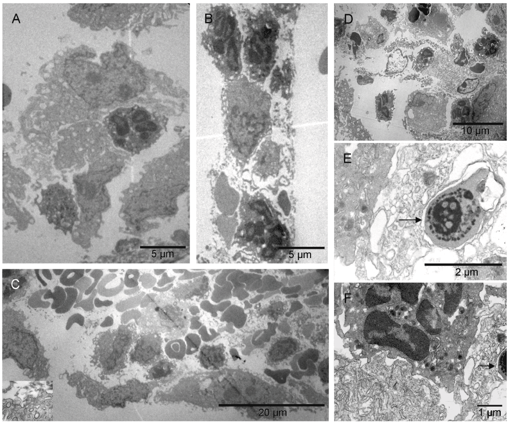 The pattern-forming heterogeneous population of the cells migrating in the hyaline membrane consisted of (a) those with large nuclei occasionally containing double nucleoli and with asymmetrically distributed, irregularly shaped, large cytoplasm and satellite platelets i.e. megakaryocytes, and (b) those with atypical, lobular, heterogeneously dark nuclei and dark cytoplasmic granules in the absence of mitochondria, usually accompanied by erythrosomes, i.e. most likely erythroblasts [A]. The four elements, cellular and sub-cellular (erythrosomes and platelets), appeared evenly dispersed among each other like in the narrow (about capillary short dimension) column in [B] or the megakaryocytes that displayed a tendency to migrate to the periphery of the larger cluster and surround the other elements [C]. Those poorly differentiated cells were probably bipotent, megakaryocyte and erythroid, progenitors [C]; compare with Figure 8 in55. The cellular and sub-cellular elements appeared to be held together with extracellular fibrous components, possibly proteoglycans and little collagen (the insert in [C]). The resulting red pattern appeared as a vascular network under low magnification of dissecting microscope. The parallel arrangement of extracellular, short, non-collagen fibers suggested mobility for the cells secreting them [D]. The extra-cellular matrix (ECM) producer [E] located to the right of the erythroblast [F] contained a composite dense body (arrows in [E & F]) characteristic of platelets (Figure 111-1, E in56).