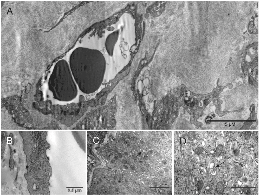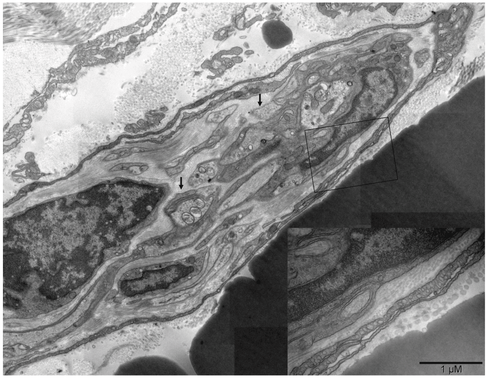 Several nerve fibers were engulfed by Schwann cells on the right but progressing myelination could be recognized only on the one in the center with three mitochondria in the section plane (left arrow). Multiple nerve boutons with synaptic vesicles (right arrow) were present but mature synapses were absent. Surrounding the nerve fibers was one to three-layer neurothelium with abundant caveolae (insert in the right lower corner). Collagen fibers located internally were thinner (20–40 nm) than those lining the external surface of the neurothelium (60–100 nm). A giant erythroschizosome was located next to the forming nerve and it had similar dimensions (right lower corner behind the insert).