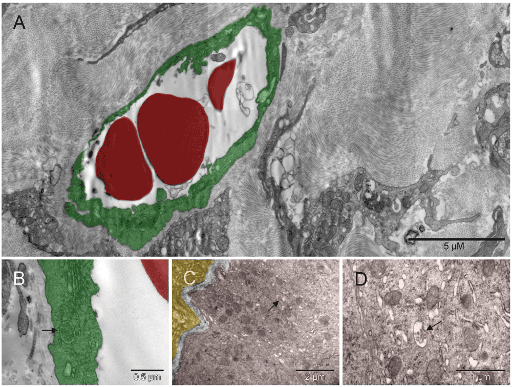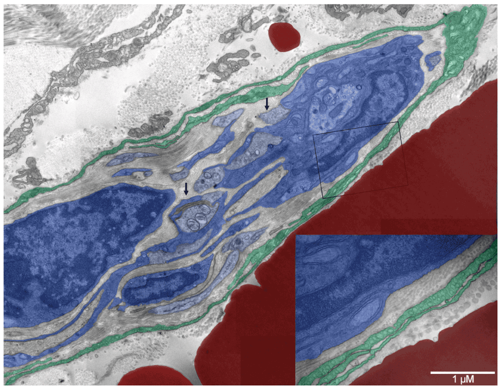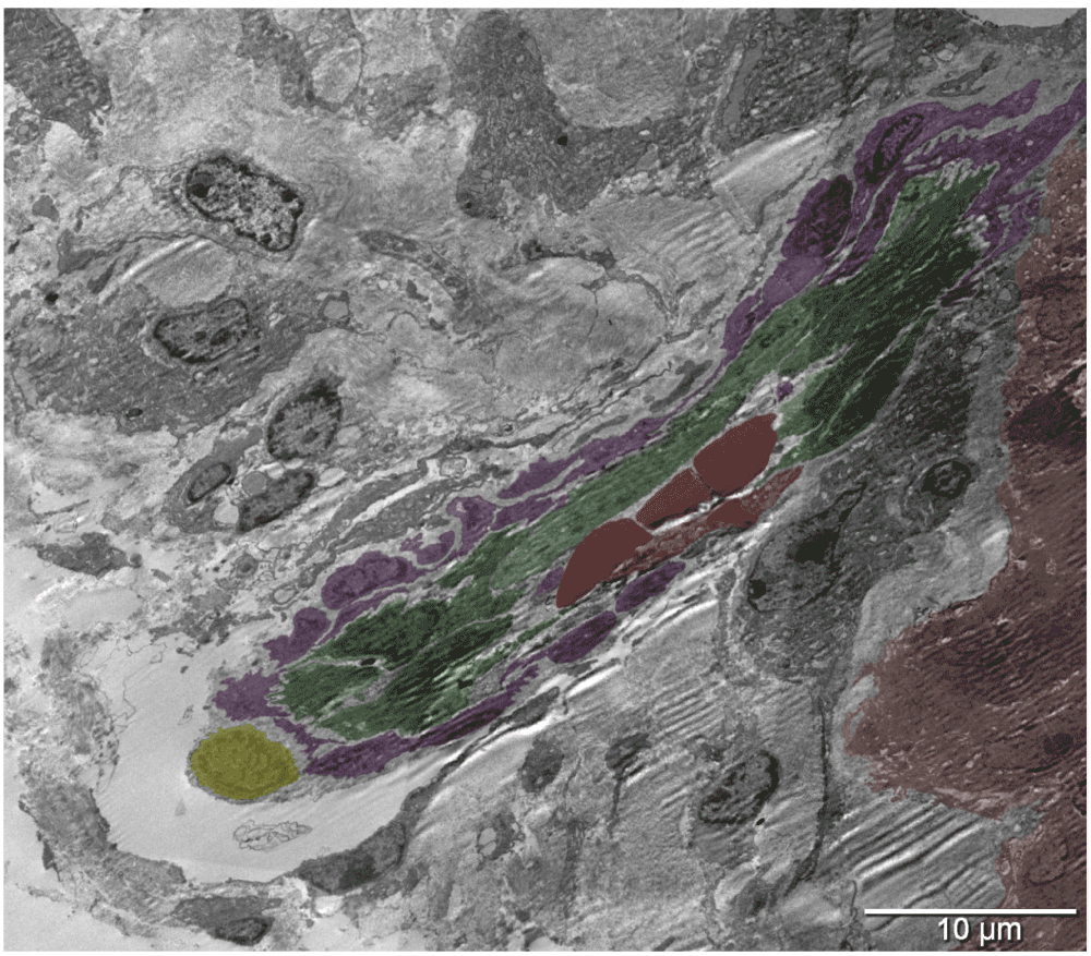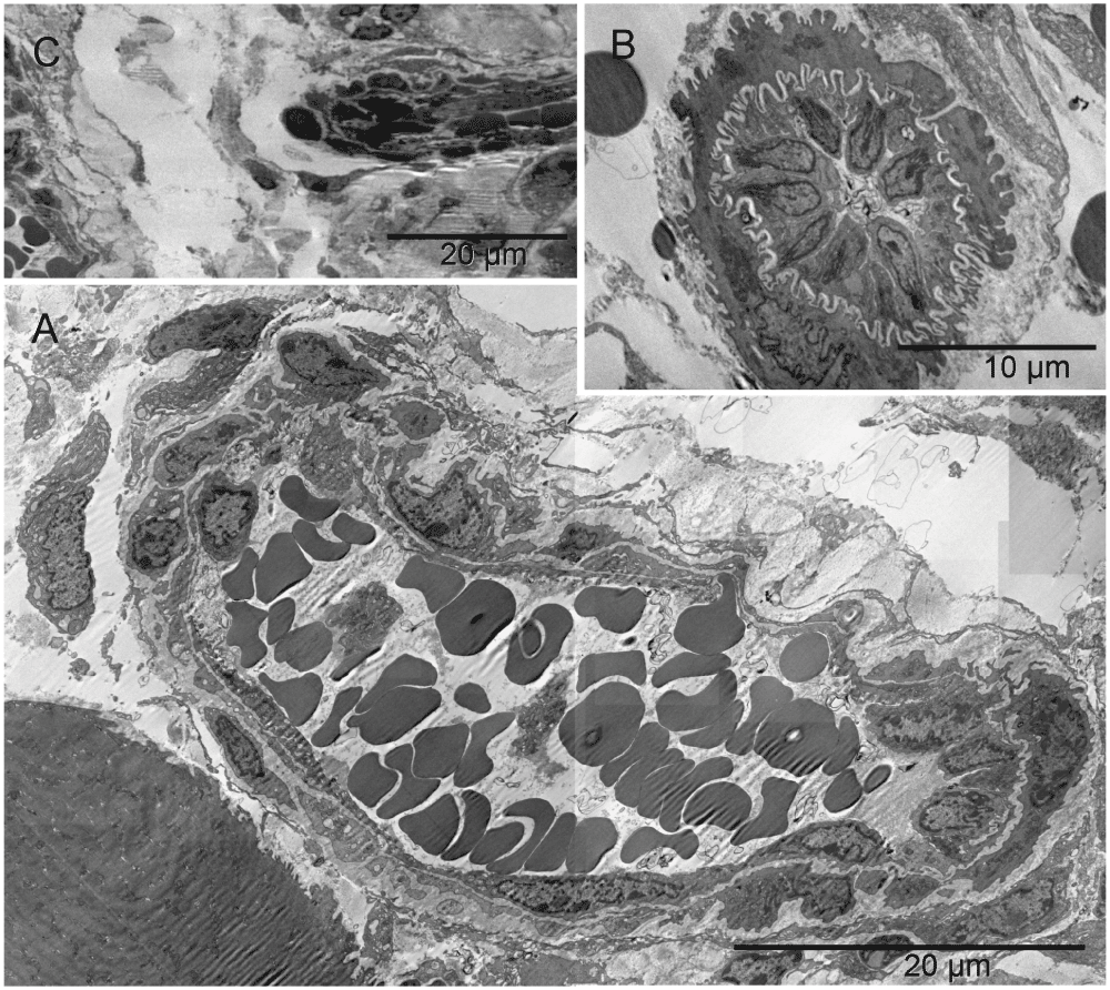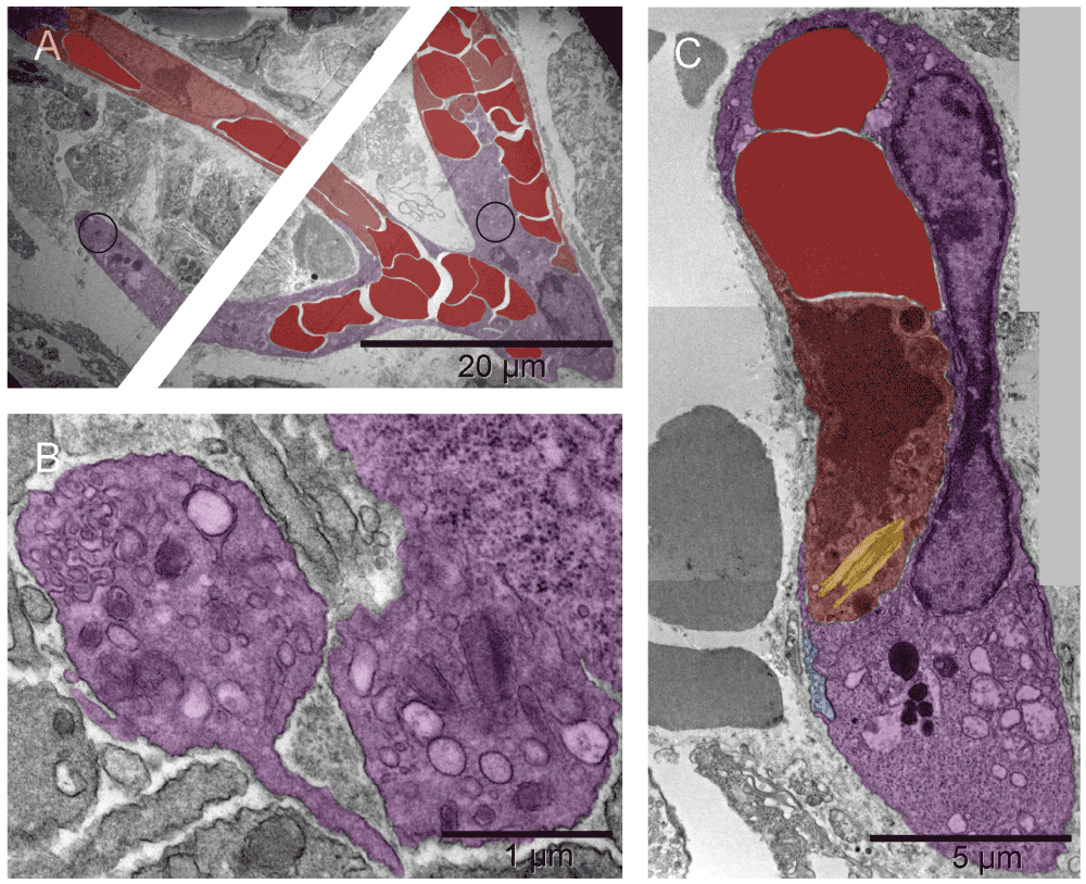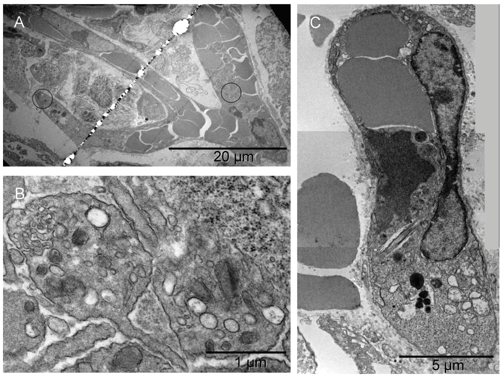 Moreover, developing nerves accompanied some forming vessels (Figure 14, Figure S14, and Figure 15 & Figure S15 [D & E]). One displayed a few nerve fibers at early stages of myelination and a lack of mature synapses despite the presence of multiple nerve boutons with synaptic vesicles. Next to it, an equivalent number of cells committed to the erythropoietic pathway generated a giant erythro-schizosome, although perhaps normally there would have been a cluster of erythrosomes (“erythropoietic lake”) in a forming vessel. Whether this particular one was going to be successful in producing normal erythrosomes or was just a part of the ongoing cytoevolution was not clear. The cells that surrounded the developing nerve did not necessarily derive from the ectoderm. They ended up on the surface of neuroplax but had much in common with endothelium, morphologically and functionally – namely, a flattened shape, plenty of caveolae to control the microenvironment of the developing neurons and Schwann cells. Caveolae were shown elsewhere to contain ATP-ase that could be processing ATP secreted by the giant erythroschizont right next to it60–63. Such concerted differentiation resulting in different functions would have been unlikely to happen without coordinated regulation of the vasculature and nerves.